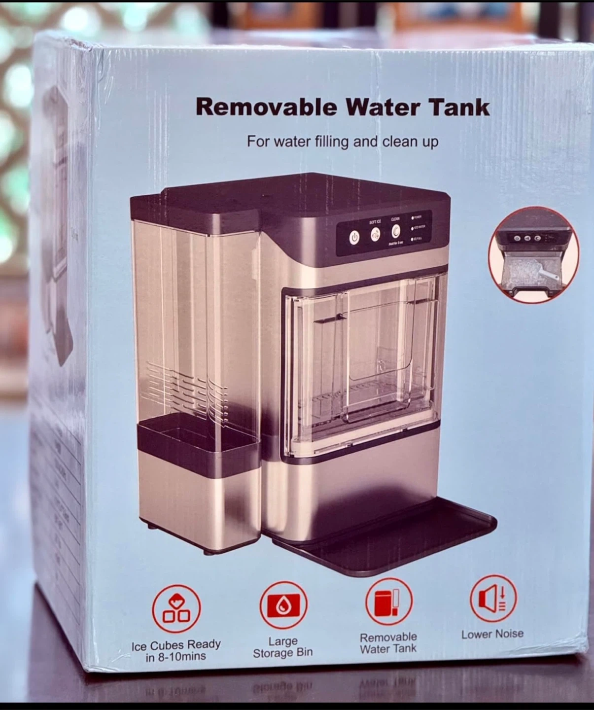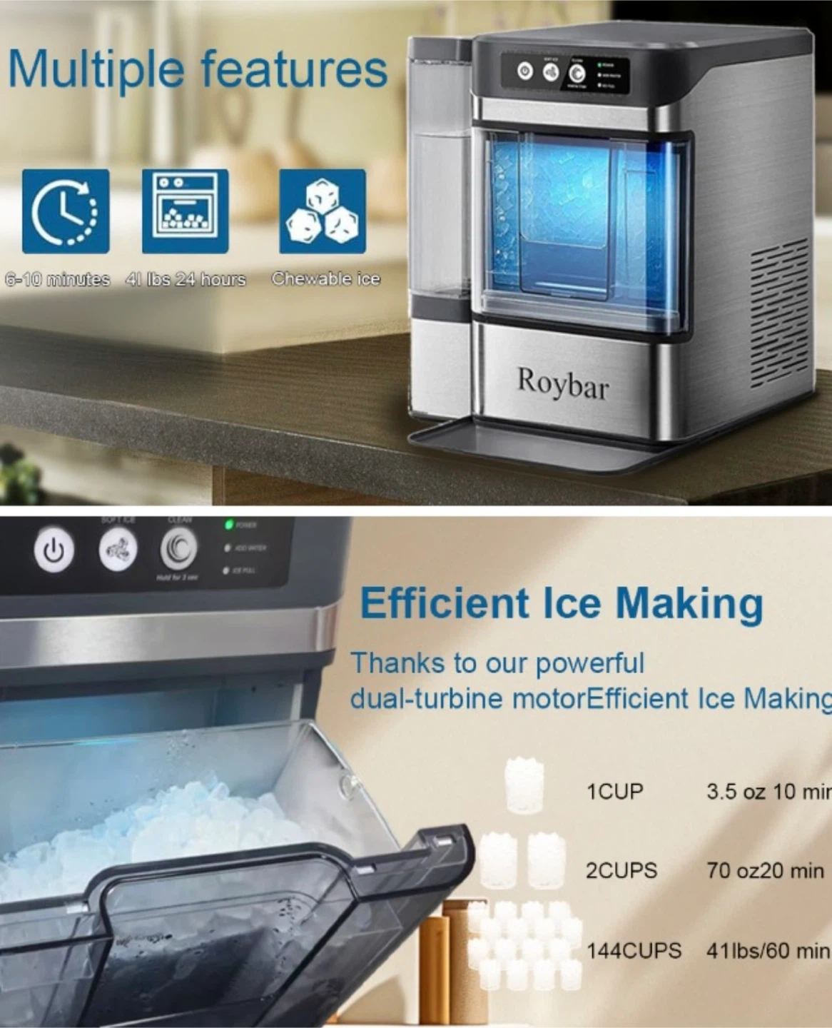 This Roybar ice maker can make ice in just 6 minutes! It can produce 41 pounds of ice per day. It also features: