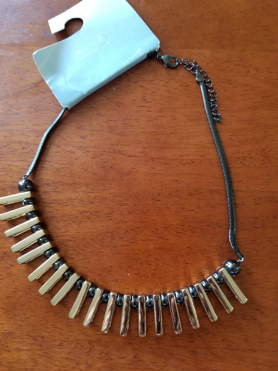 This is a cute Clio necklace with gold and black accents! It's a great accessory. Brand new