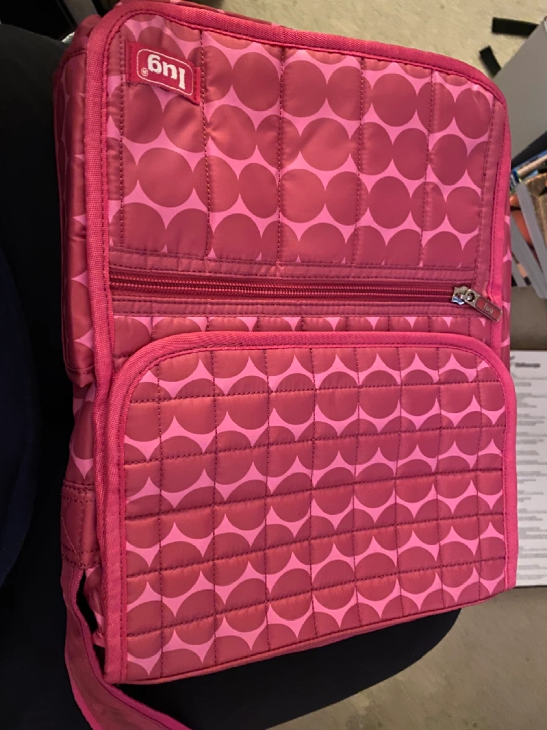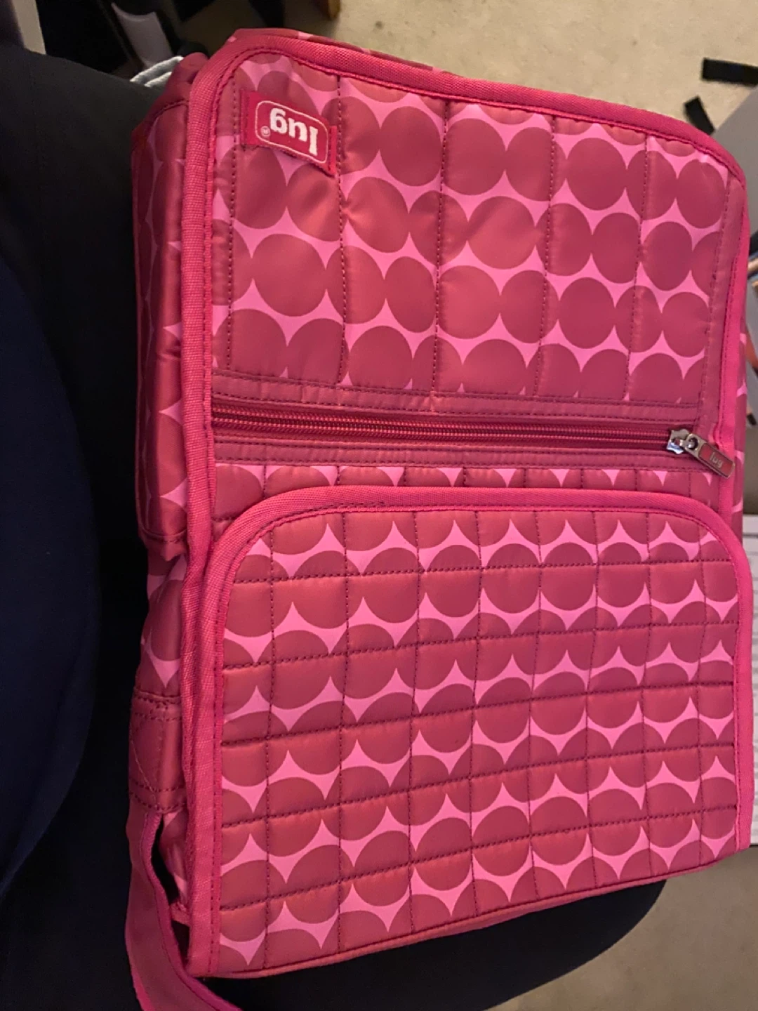 Check out this versatile Lug convertible bag! It can be The bag features a stylish pink colour and a unique polka dot pattern. It's in great condition and ready for a new owner! Umbrella/bottle expandable pocket, shoulder strap, magnetic closures