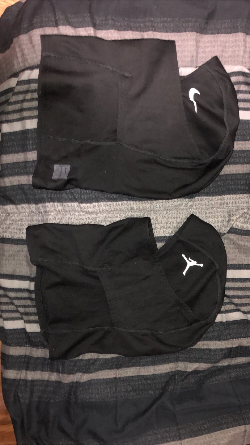 Selling a Nike and Jordan ski mask both are black Nike one is newer then Jordan ski has the tag no fading with the tags Jordan’s ski is missing tags (nike ski 30$ Jordan ski 20$ 50$ for both ski masks