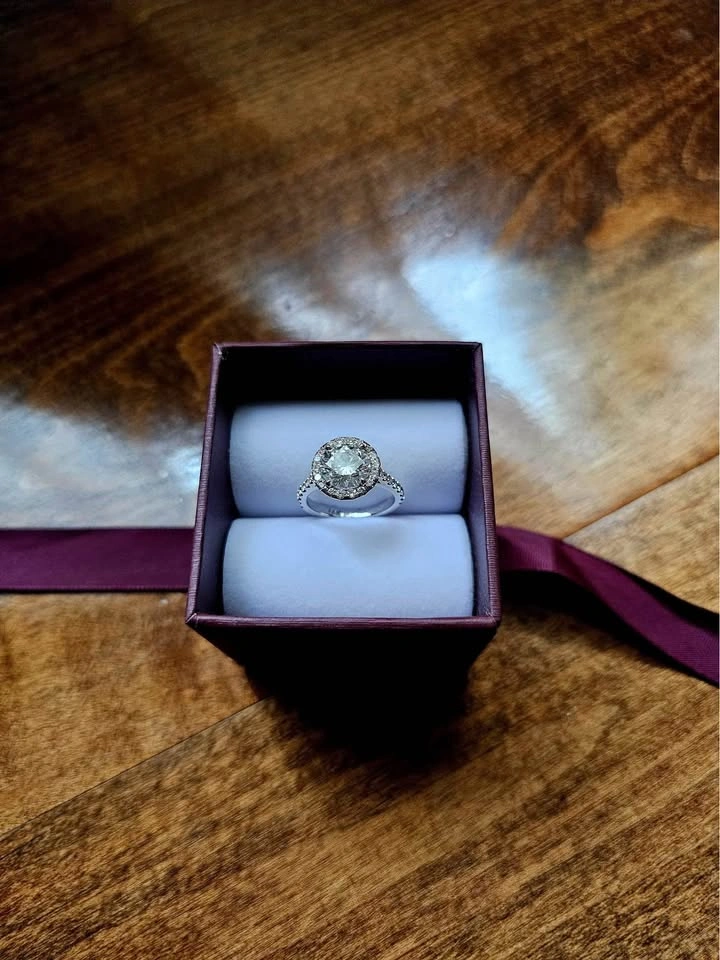 This beautiful ring it’s a 2 ct lab grown center stone and 0.75 CTs on halo and shank. It’s made on 14k white gold on a size 6.5. Can resize it for free.