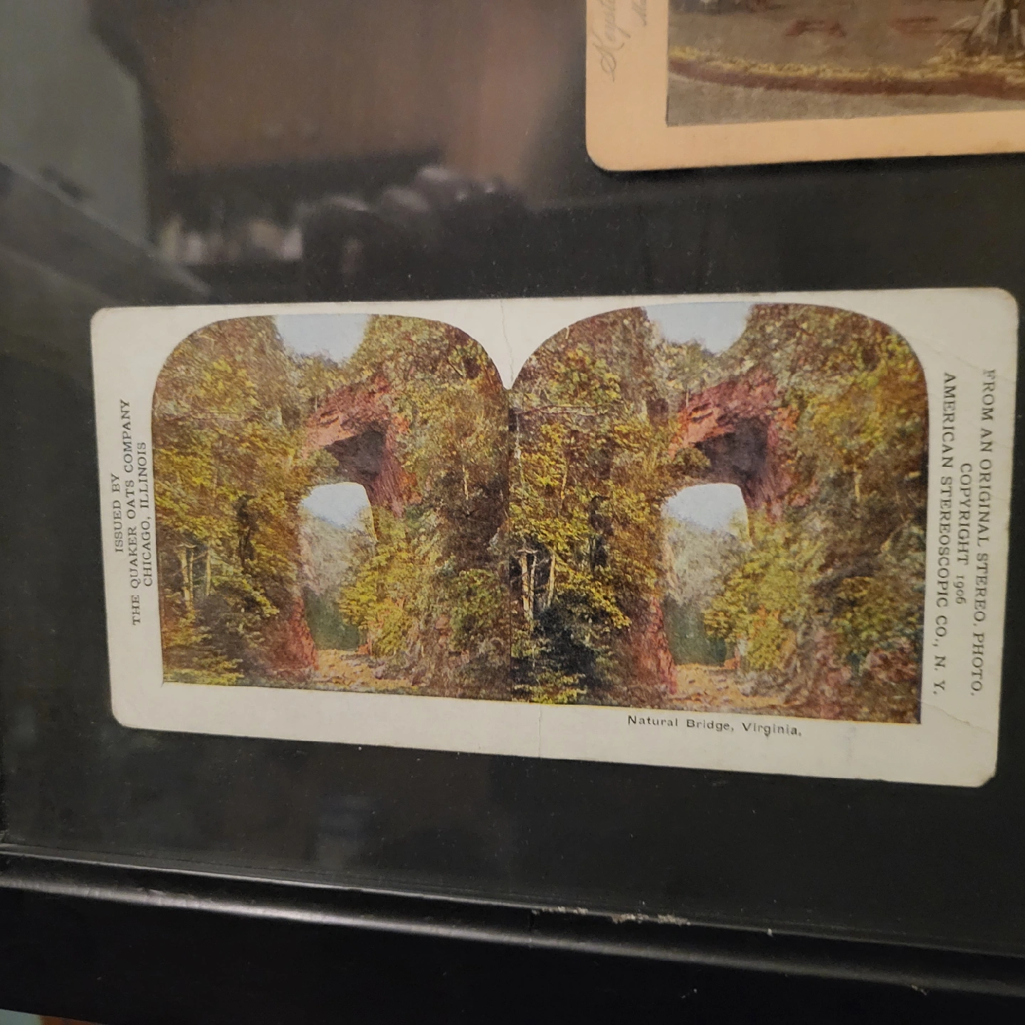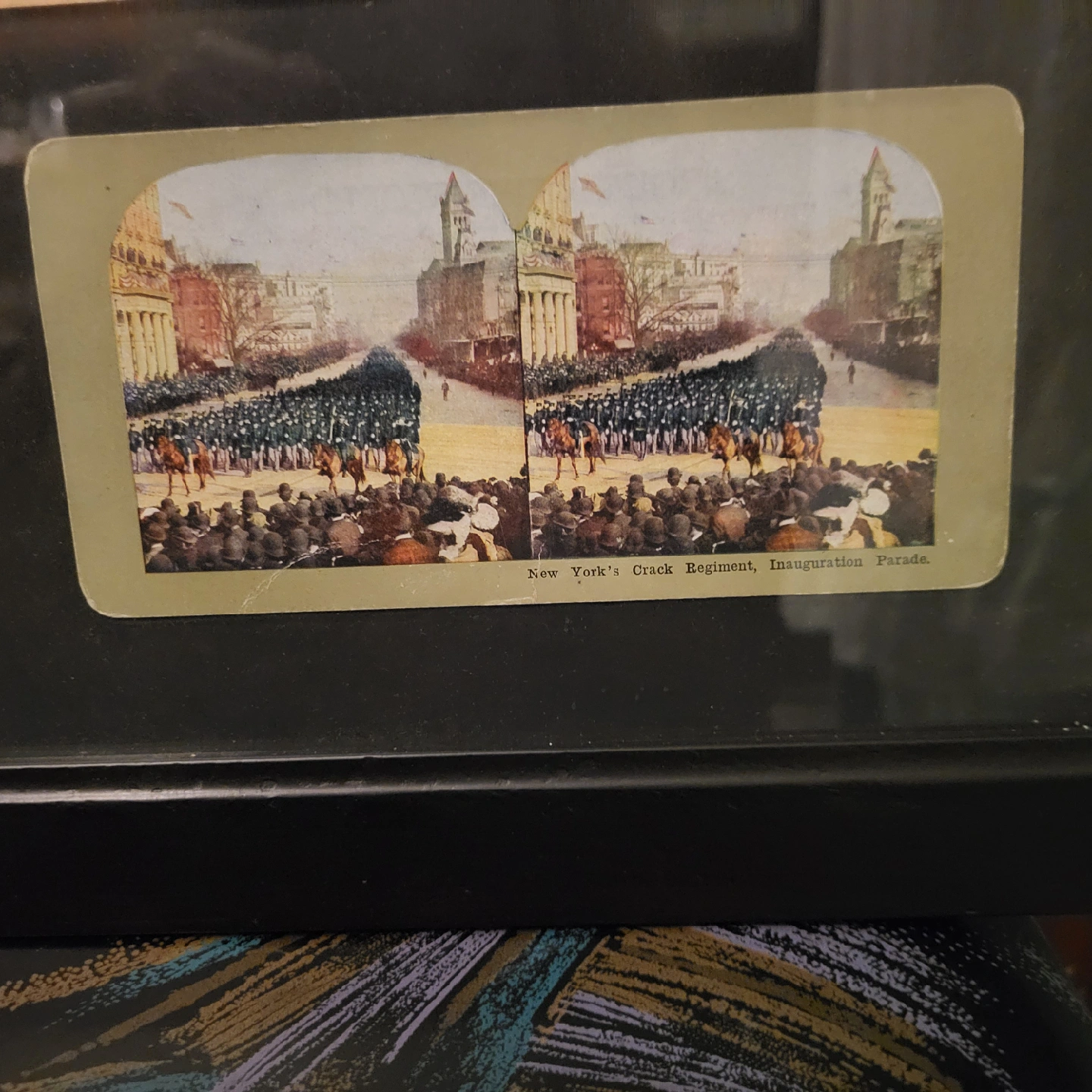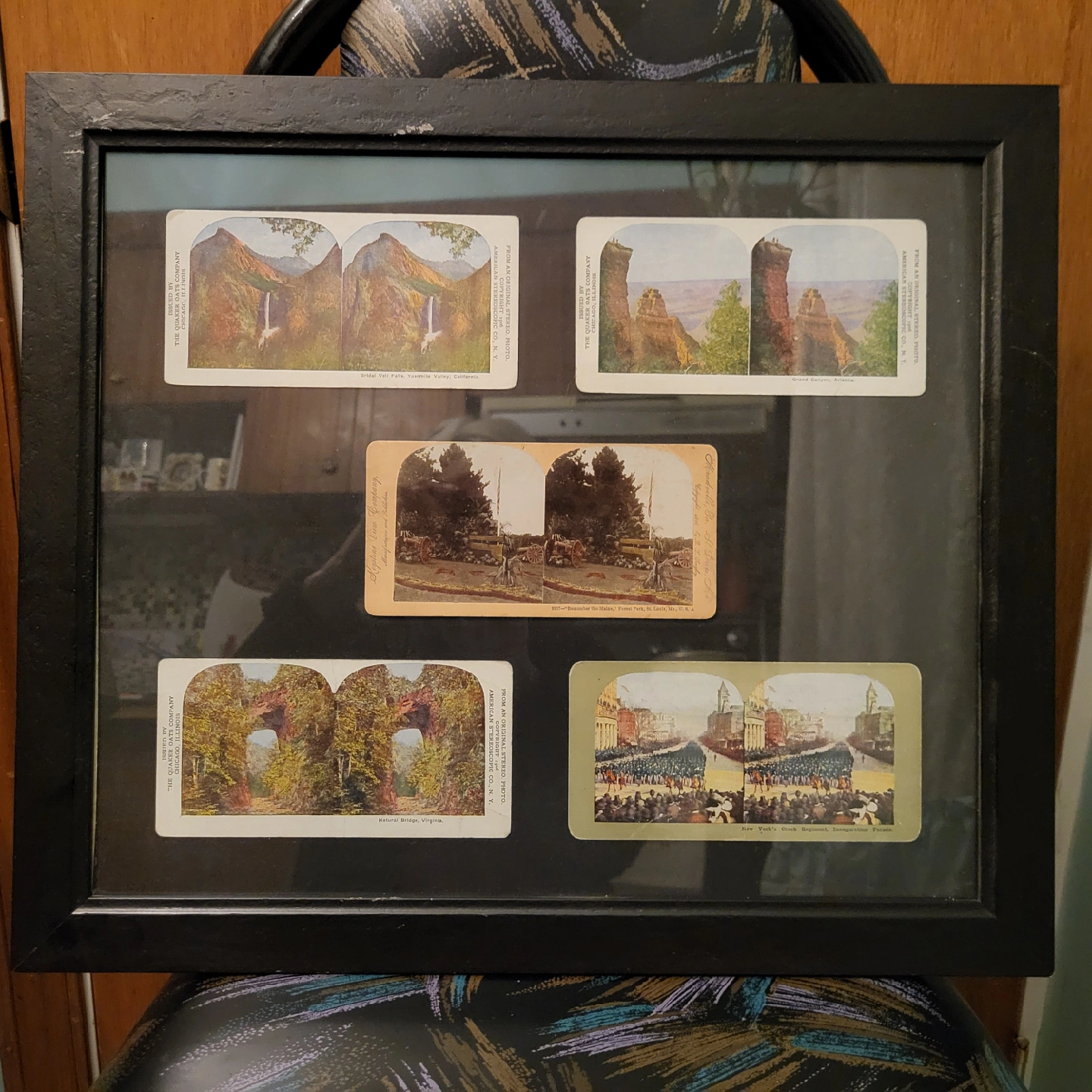 231Framed collection of stereoview cards behind glass. The frame is from Off The Wall. Includes stereoviews of Natural Bridge, Virginia, and New York's Crack Regiment, Inauguration Parade. 20 x 18 x 1 inch