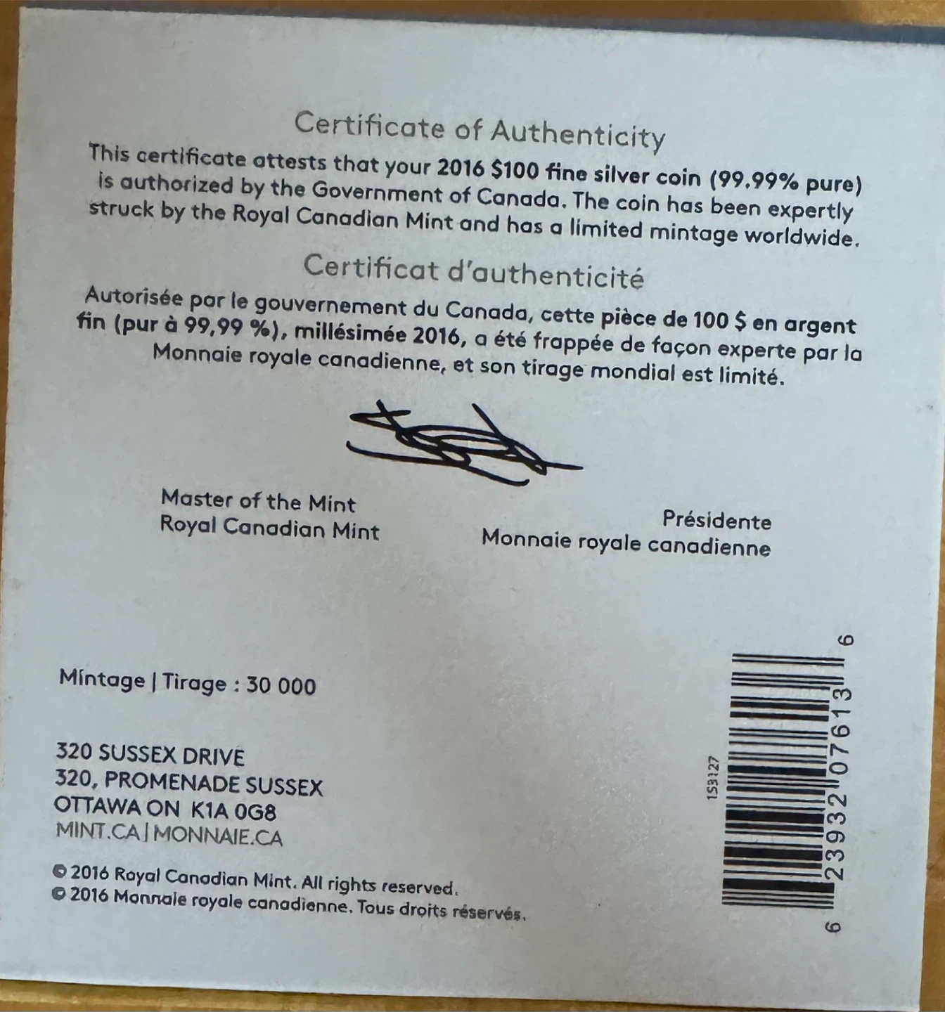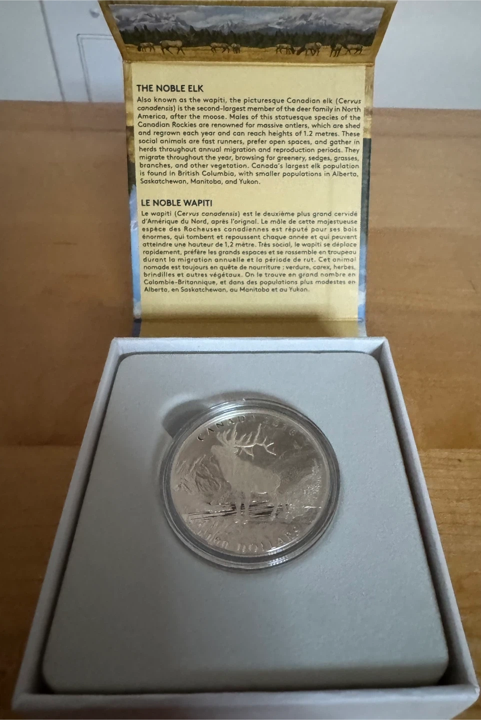 20Selling a 2016 $100 fine silver coin (99.99% pure) struck by the Royal Canadian Mint. It features The Noble Elk (wapiti).