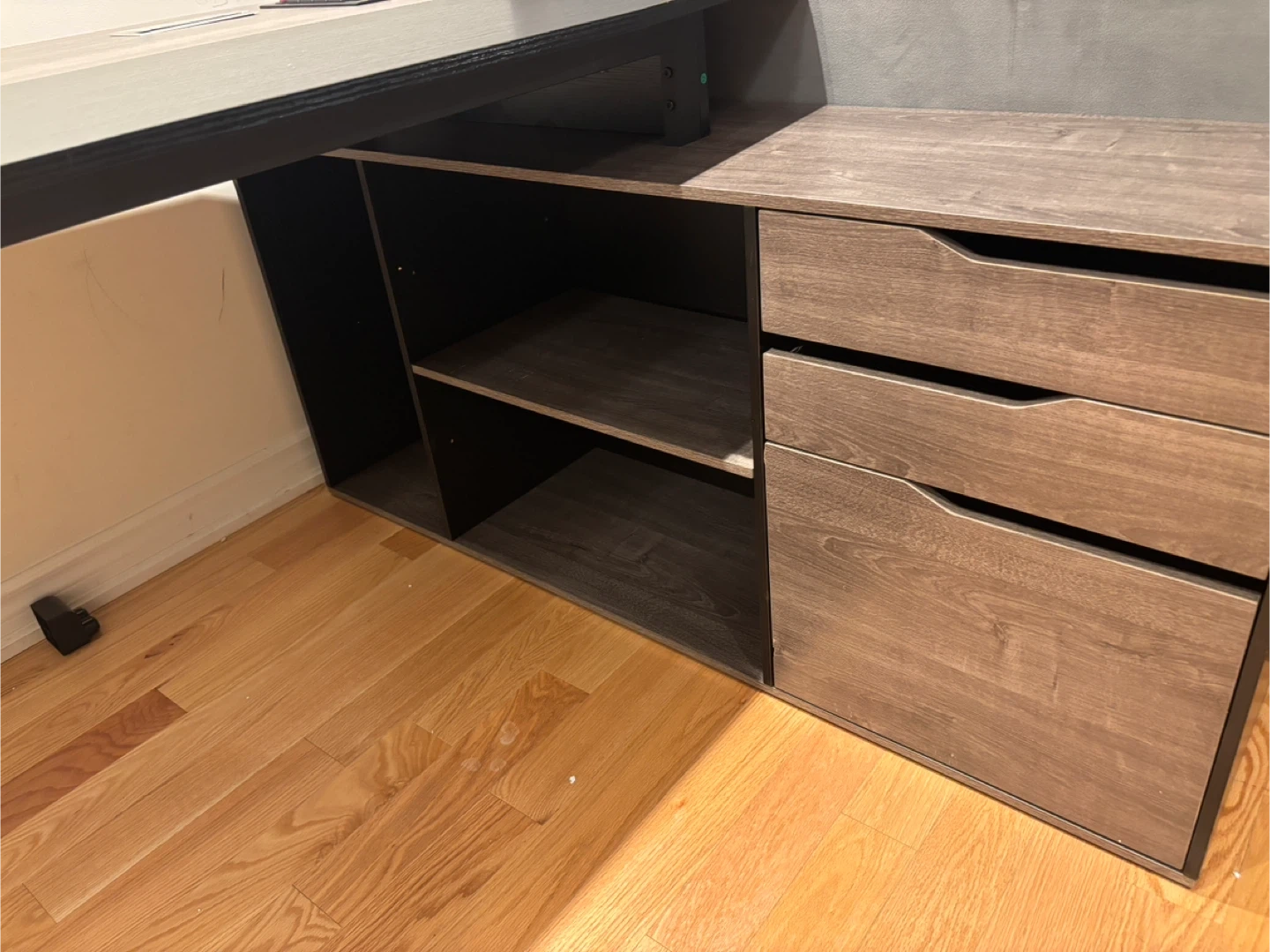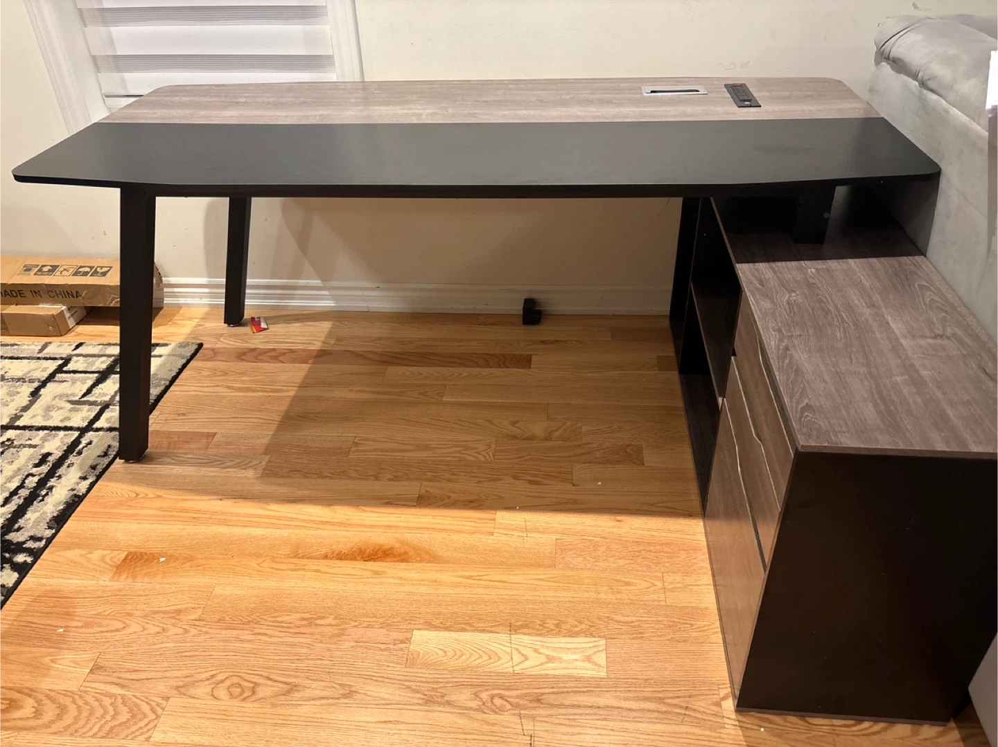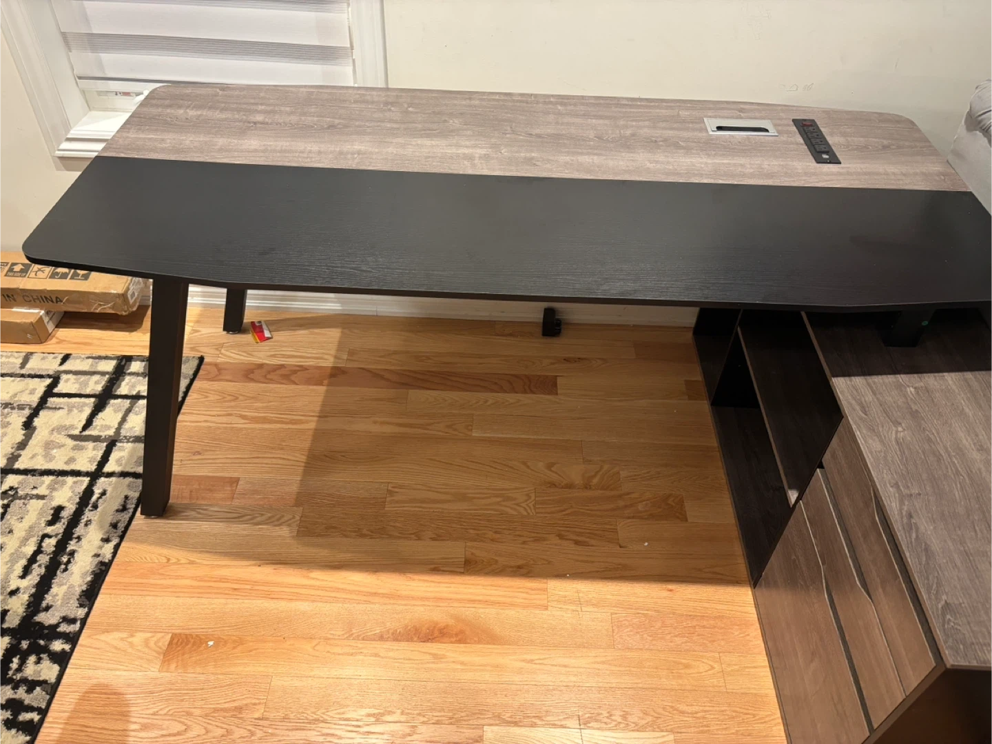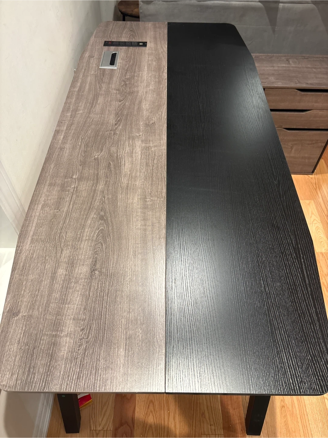 226New two-tone office computer desk featuring a light wood grain and black finish. It comes with a built-in power bar and USB ports, making it super convenient for all your devices. Perfect for a home office or study space. Available for pickup and delivery