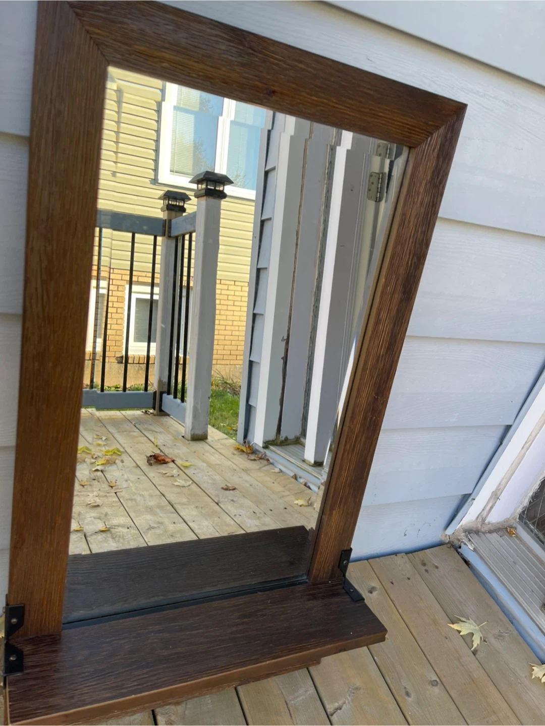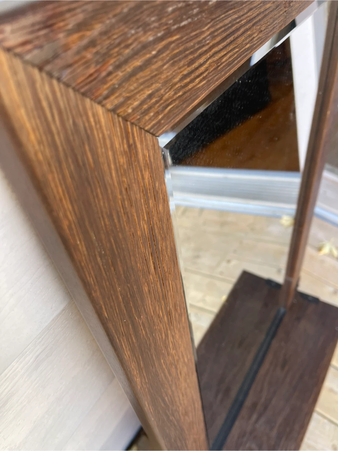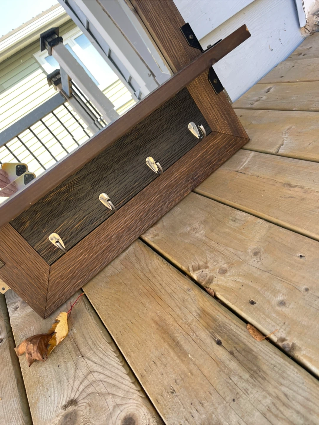 Selling a wood-framed mirror that comes with built-in hooks! It's a stylish and functional piece, perfect for adding a touch of rustic charm to your home. The hooks make it ideal for hanging keys or small accessories