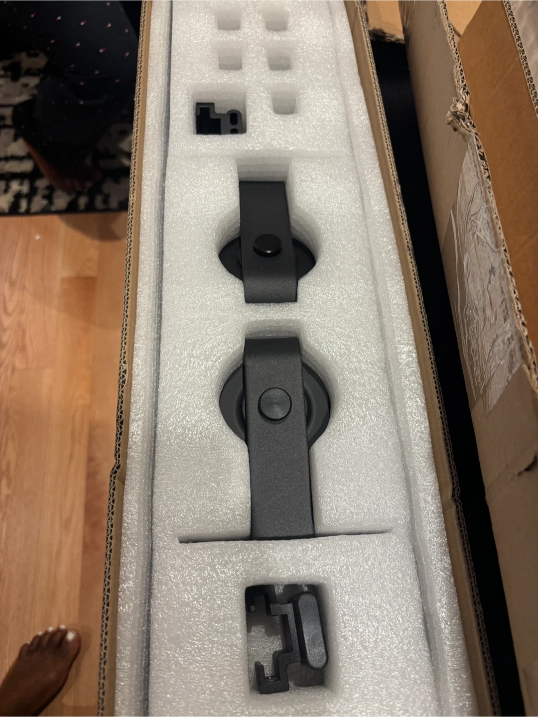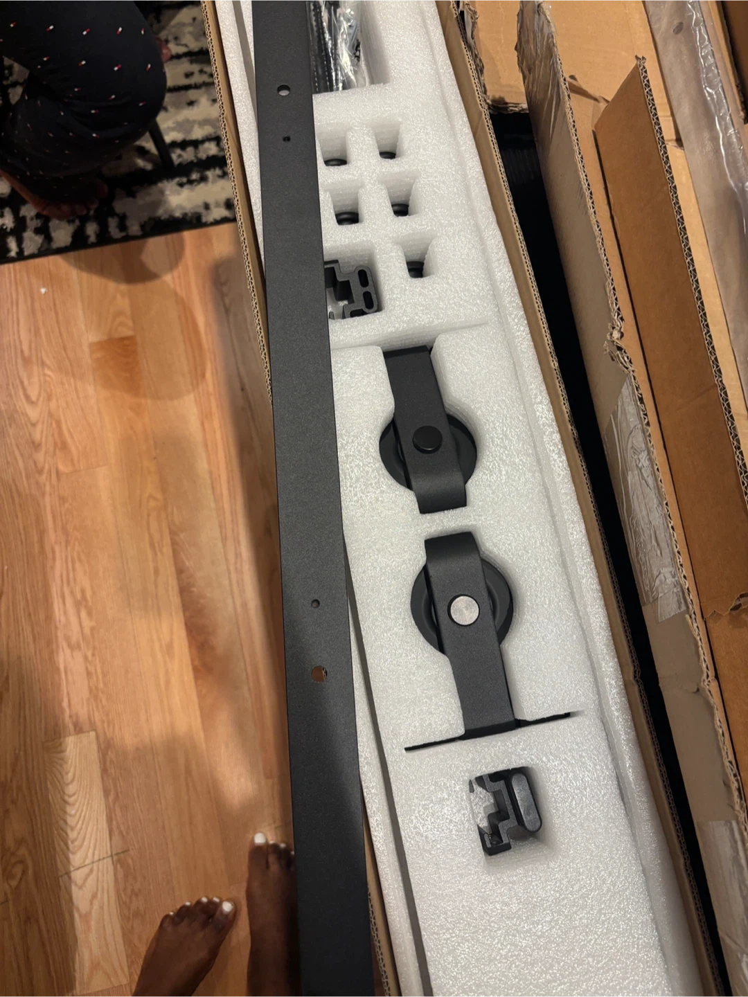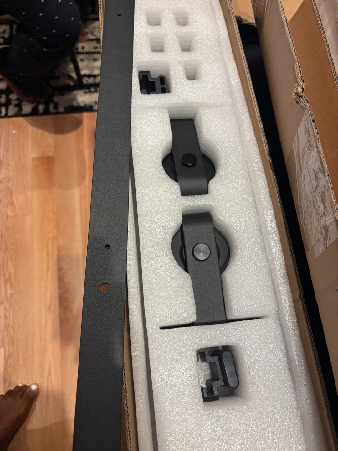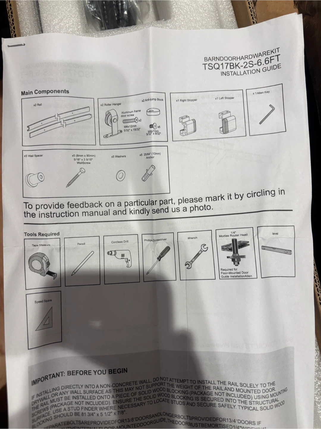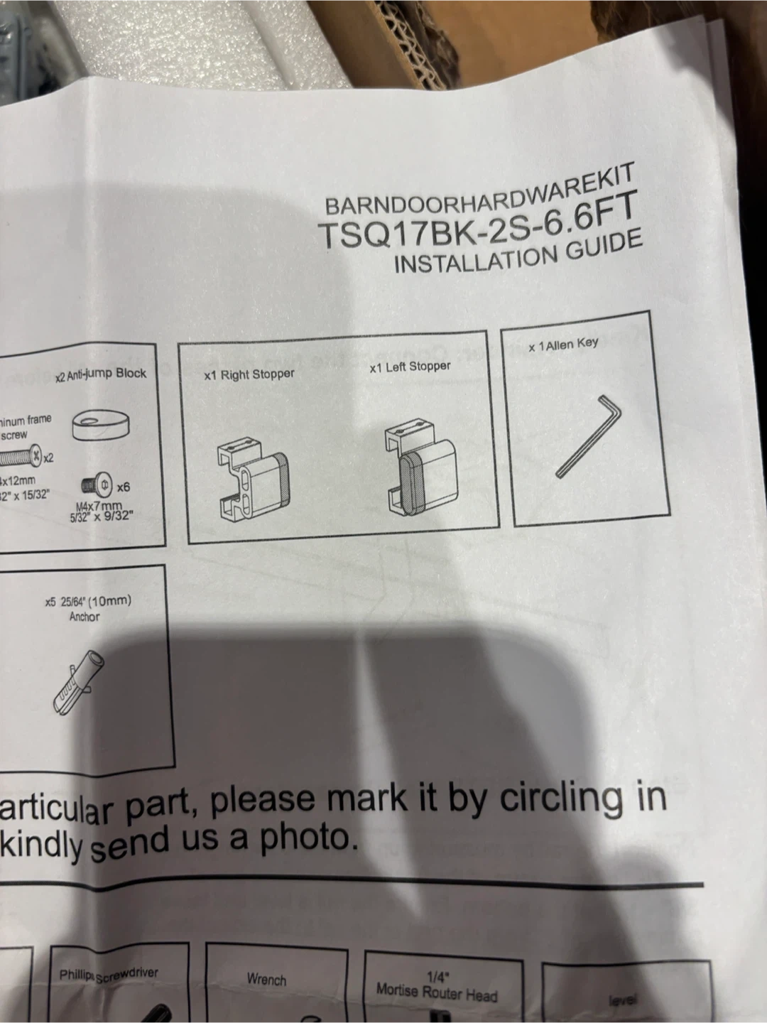 202Selling a brand new barn door hardware kit! This kit is the TSQ17BK-2S-6.6FT model. It includes all the necessary components for installation, such as: - 2 Anti-jump blocks - Right and left stoppers - An Allen key - Anchors It's designed for smooth and quiet operation with premium nylon wheels and rubber cushioned stoppers Available for pickup and delivery