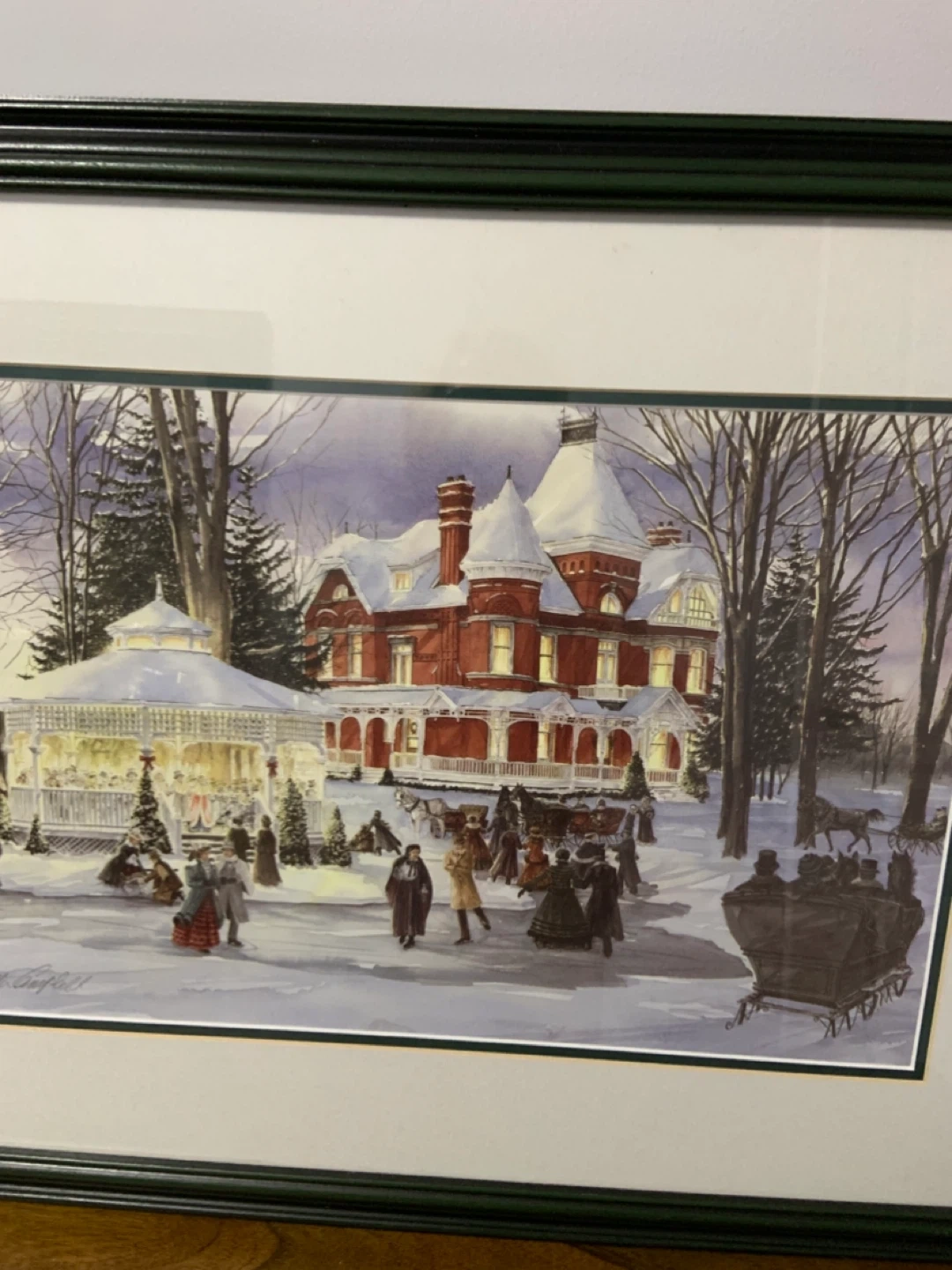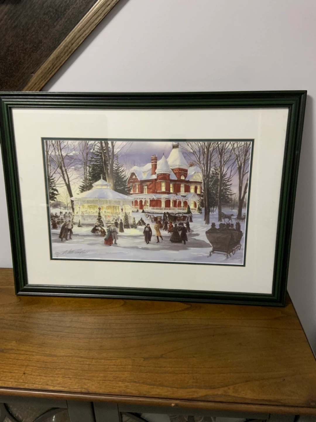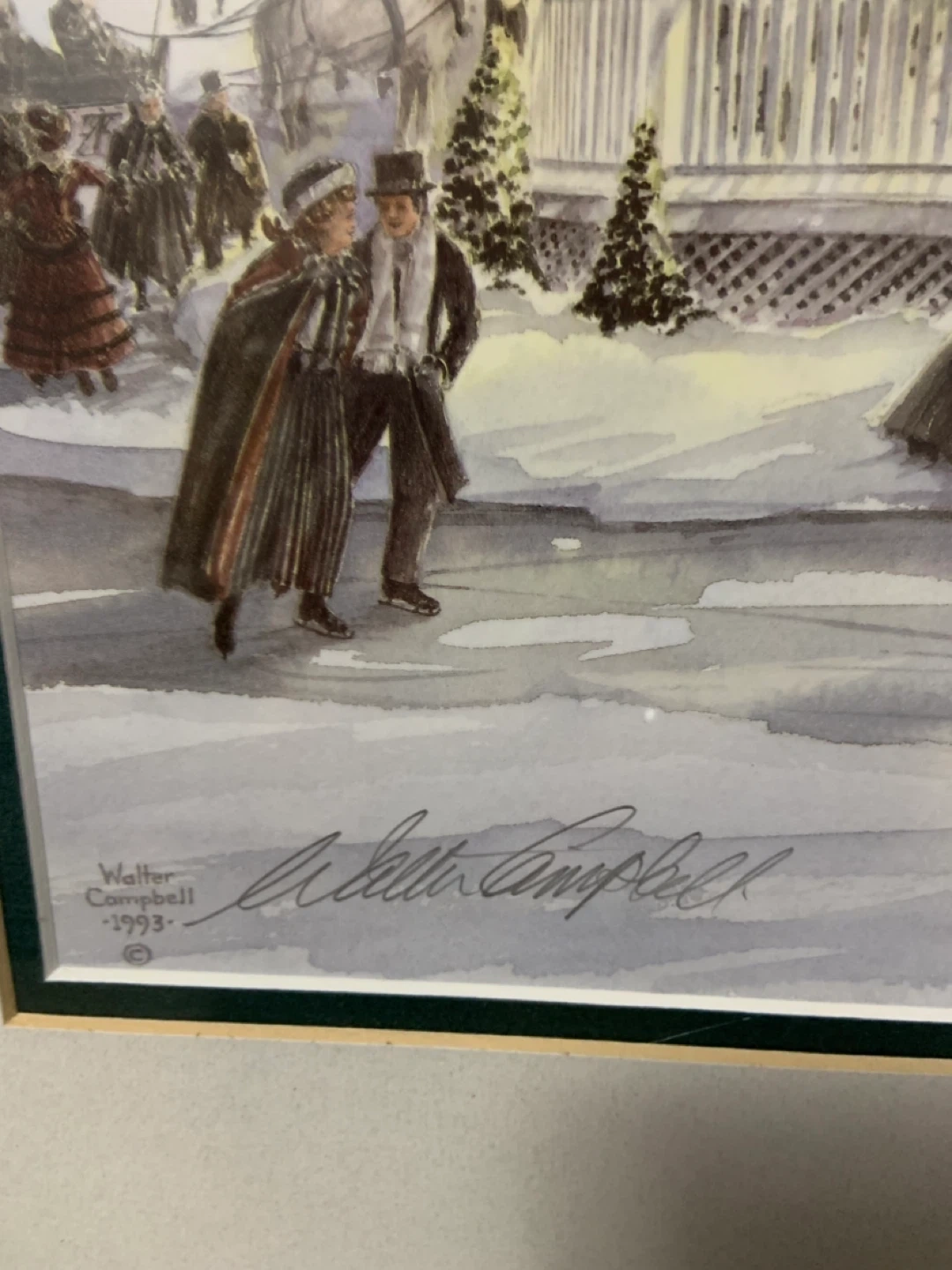 Here's a lovely framed print by Walter Campbell. It depicts a winter scene with people, a horse-drawn carriage, and a grand house. The frame is green and complements the artwork nicely. It would be a great addition to any home! Measures 28 in length with is 21 in approximately.