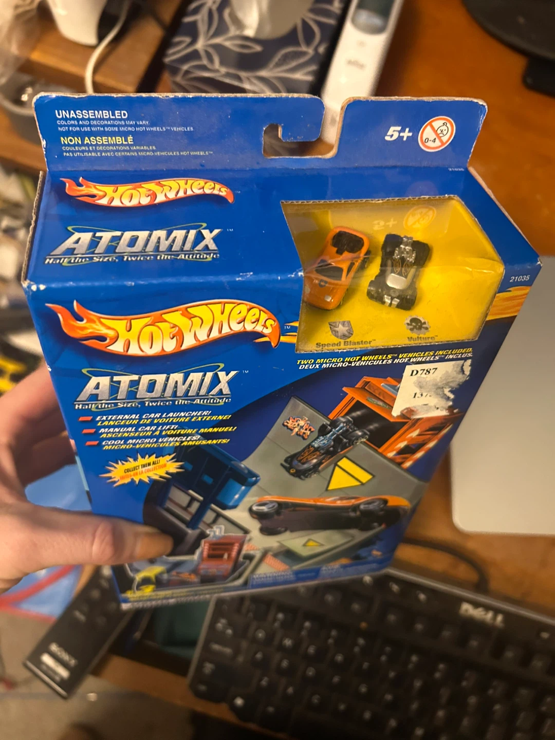 Selling a Hot Wheels Atomix set, "Half the Size, Twice the Attitude"! This set includes two micro-mini Hot Wheels vehicles. It also features an external car launcher and ramps for cool stunts. Perfect for collectors and kids alike!