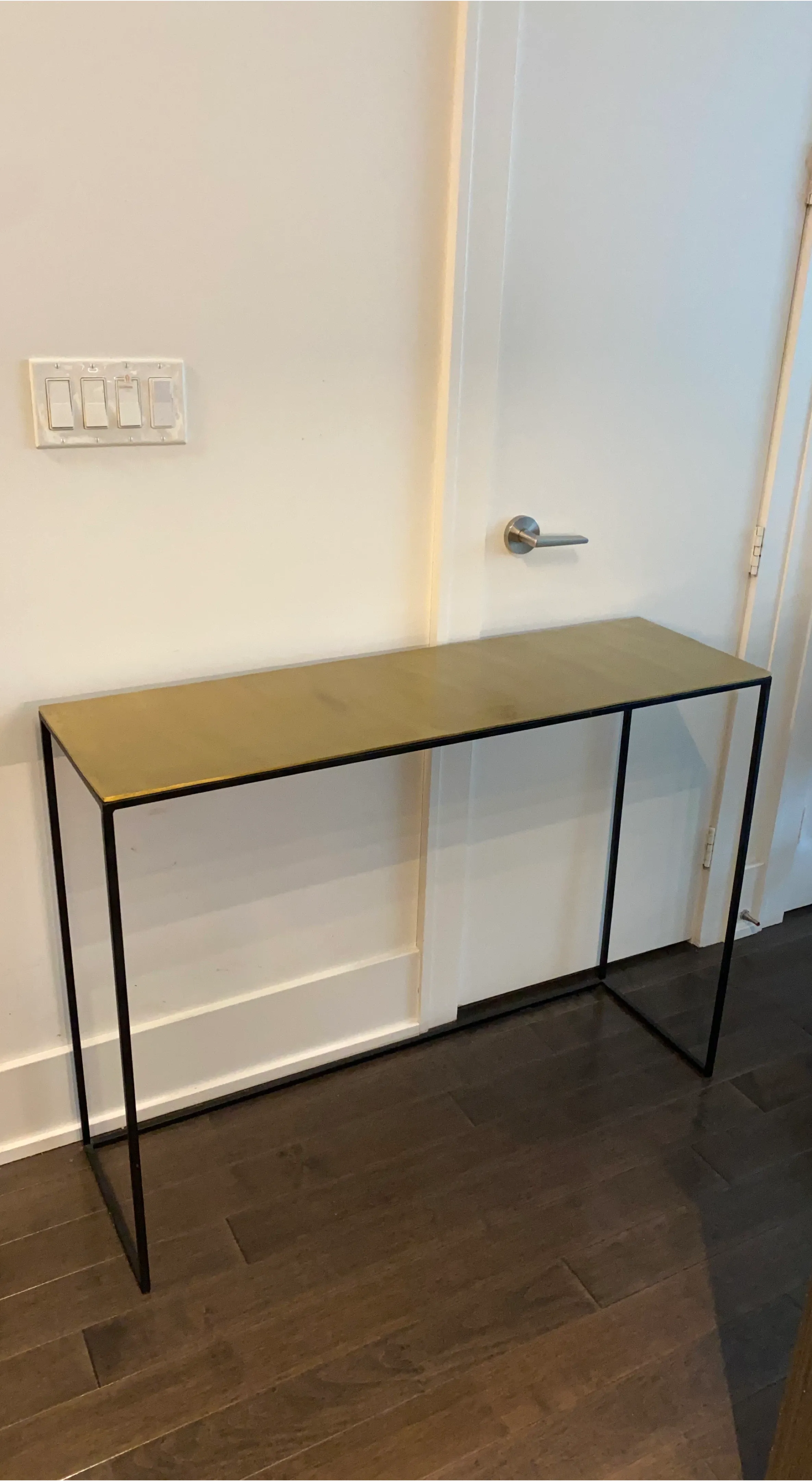 A sleek console table with a gold top and black legs. It's in great shape and would look lovely in an entryway or living room