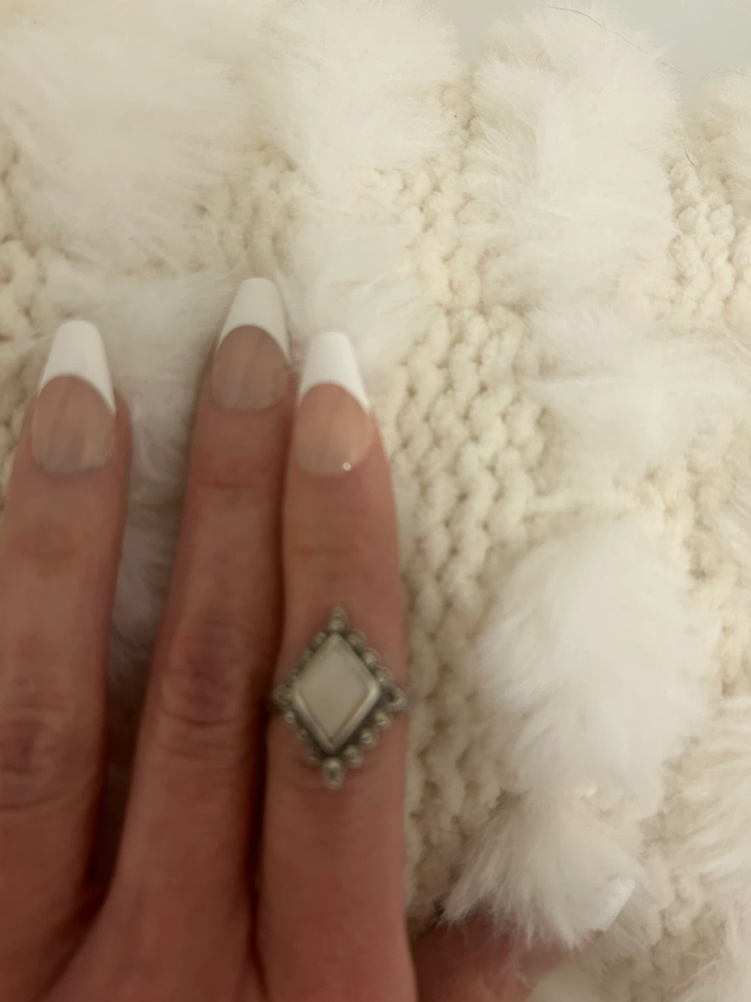 My pictures aren’t good as this ring is stunning in person .Selling a vintage ring with a unique diamond-shaped design! It has a lovely, classic look and is in good condition it’s is mother of pearl and Marcasites stones all around . , 925 silver ring size 4-5
