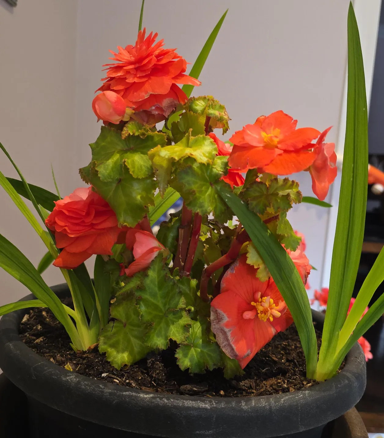 A beautiful red begonia plant in a pot, ready to brighten up your home or garden! The plant features vibrant red flowers and lush green leaves. It's a lovely addition to any space