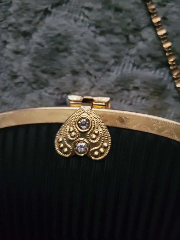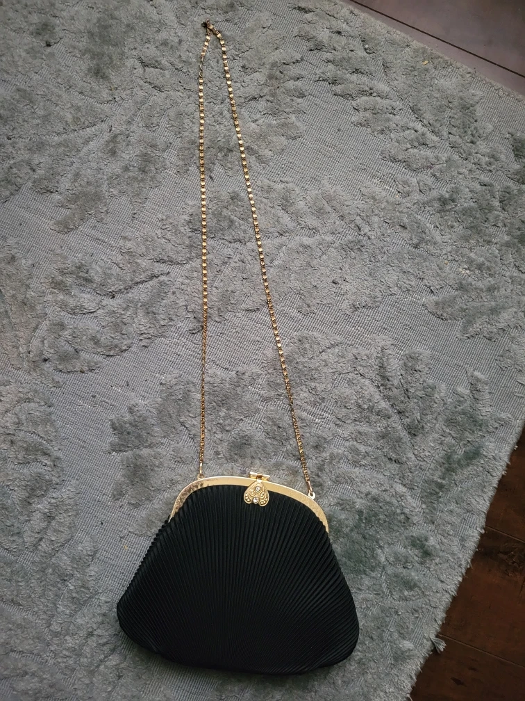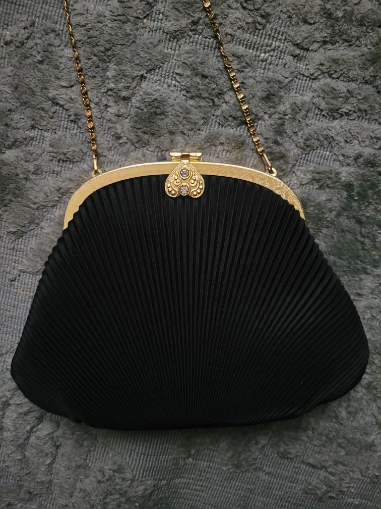 Giving a lovely black pleated evening bag with a gold-tone chain! The clasp has a decorative heart-shaped that's super cute!