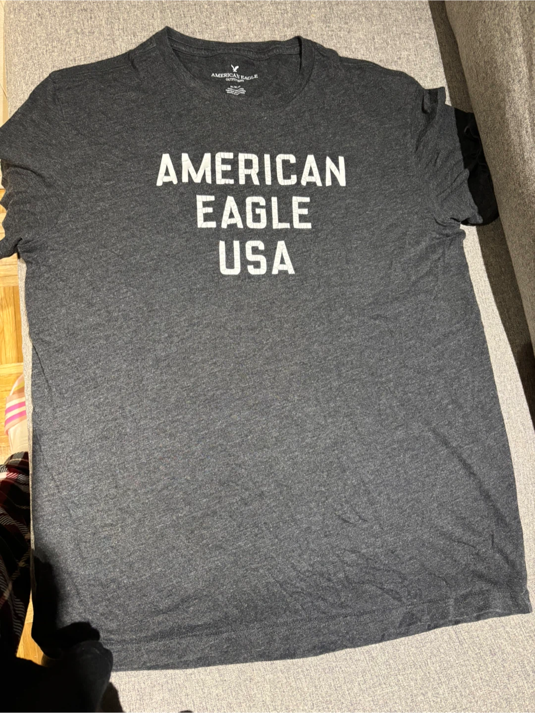 American Eagle grey T-shirt for sale! It's in great condition and is a size XL. The shirt features the American Eagle logo and 'USA' printed on the front. Perfect for casual wear!