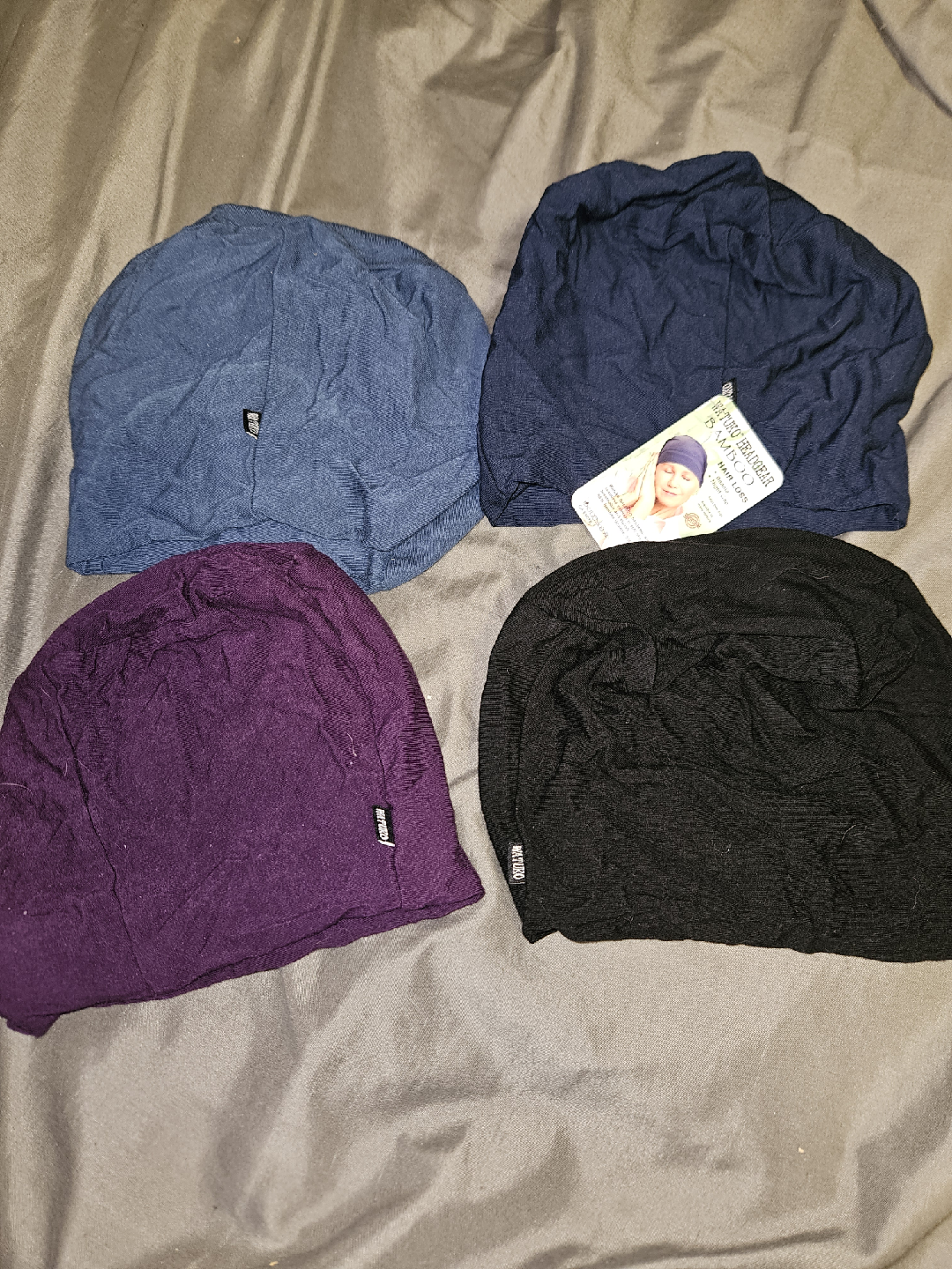 Selling a set of Watuko Headgear Bamboo Beanies. These are great for hair loss or as a comfy sleep cap. Available in a variety of colours: blue, dark blue, black, and purple. They are made of bamboo material.