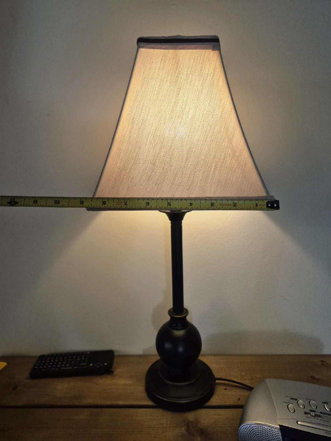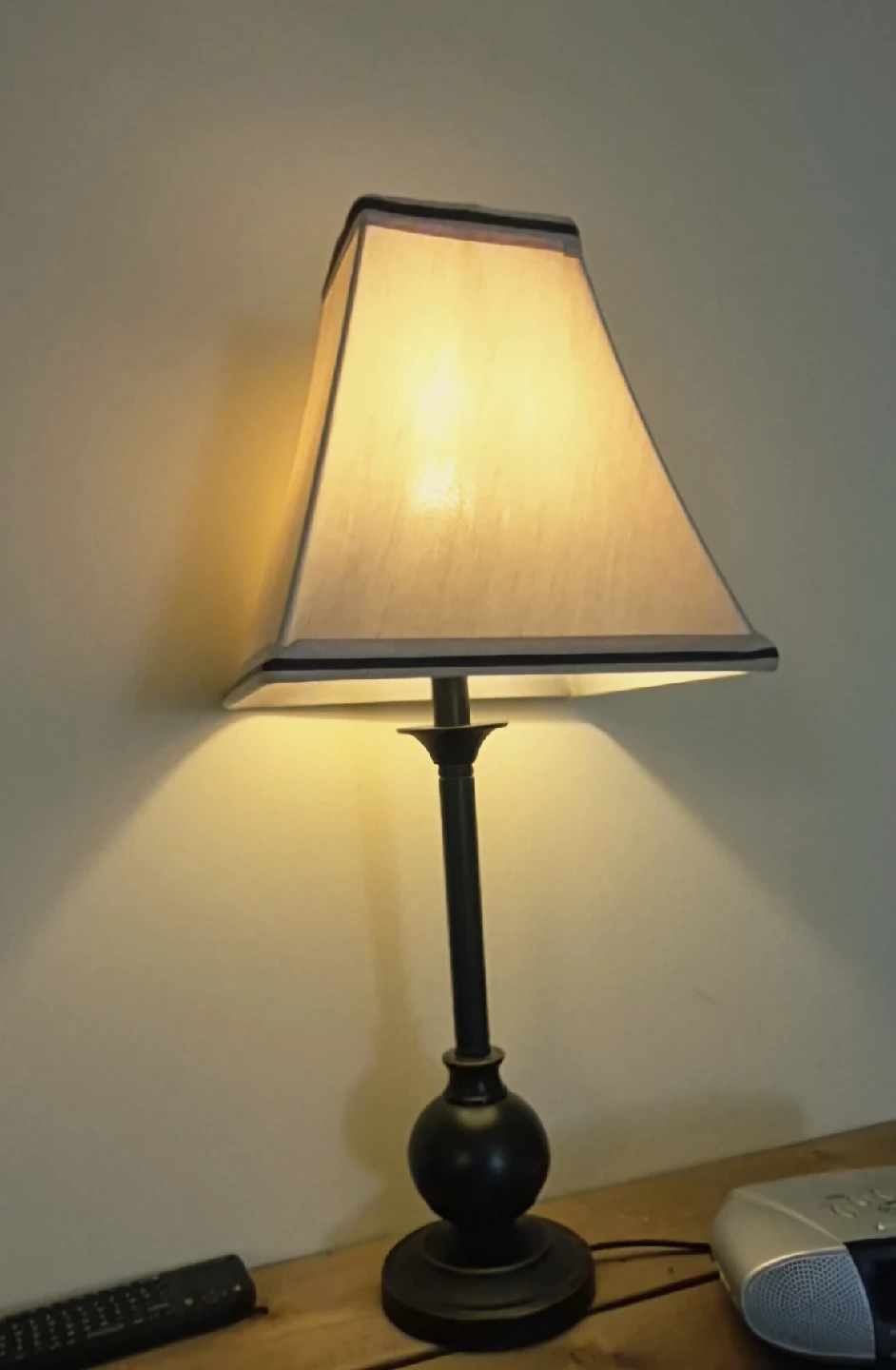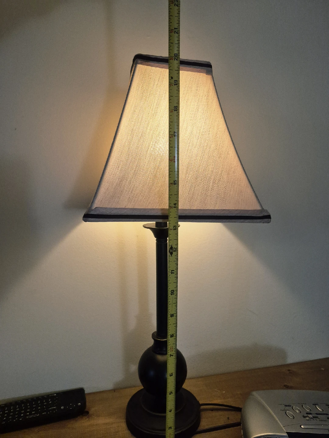 Selling a table lamp with a black base and a beige shade. It stands approximately 20 inches tall.