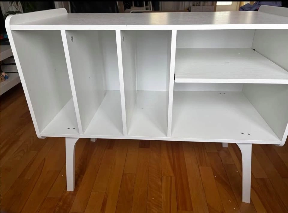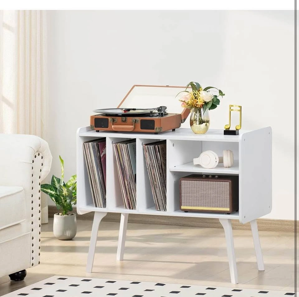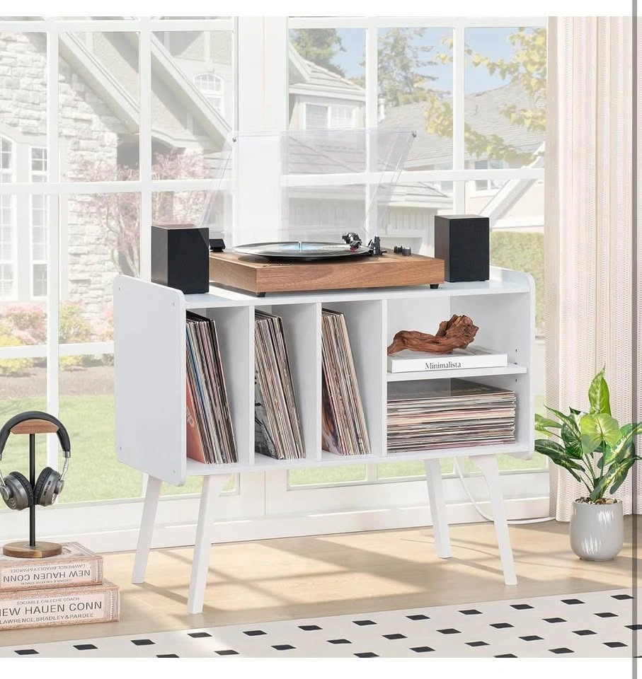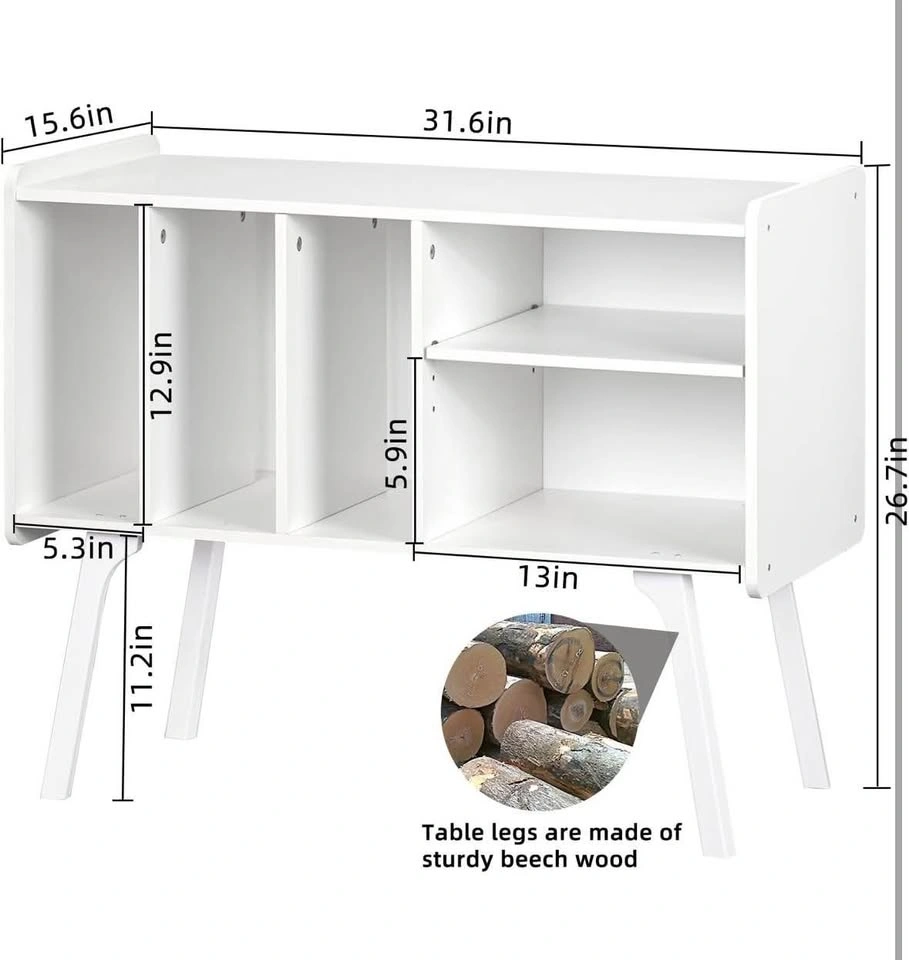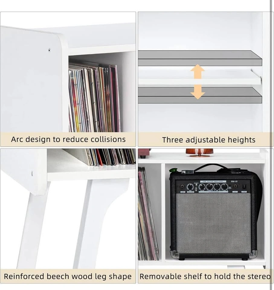 143The size of this vinyl record storage is 31.6 "L x 15.6" W x 26.7 "H. The spacious top can accommodate all sizes of record players. The storage capacity is up to 220 records, providing abundant storage space for all record lovers. The classification structure is designed to sort out different styles of records, albums and even magazines, so that you can quickly find the record you want. In order to make the structure of this record player stand more sturdy, we designed a special seven shaped legs with both beauty and support. The table legs are reinforced with special screws inside. For the material selection of the table legs, we used the valuable European beech wood. The clear natural grain and clean contours of the beech wood legs add a remarkable textural glamour to the turntable stands. We have thoughtfully designed a removable plate on the right side of the record storage. This removable plate has three adjustable heights, and you can also even remove the plate to place the voice box. The baffles on both sides of the top of the record stand can add an extra layer of protection for your precious record player, and the rounded edge design can prevent accidental collisions. In addition to being a record player stand with storage, you can also use this record cabinet with your imagination and needs, such as a side table. It can be placed in the living room, bedroom, room, study room , activity room and even office. The vintage vinyl record storage adds a charming and sensual atmosphere to each corner you put it.
