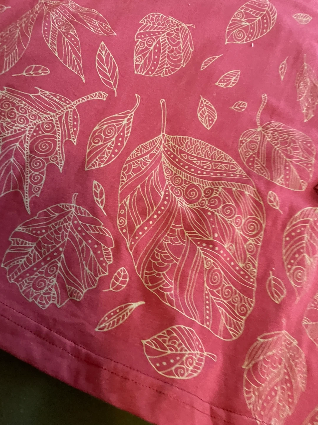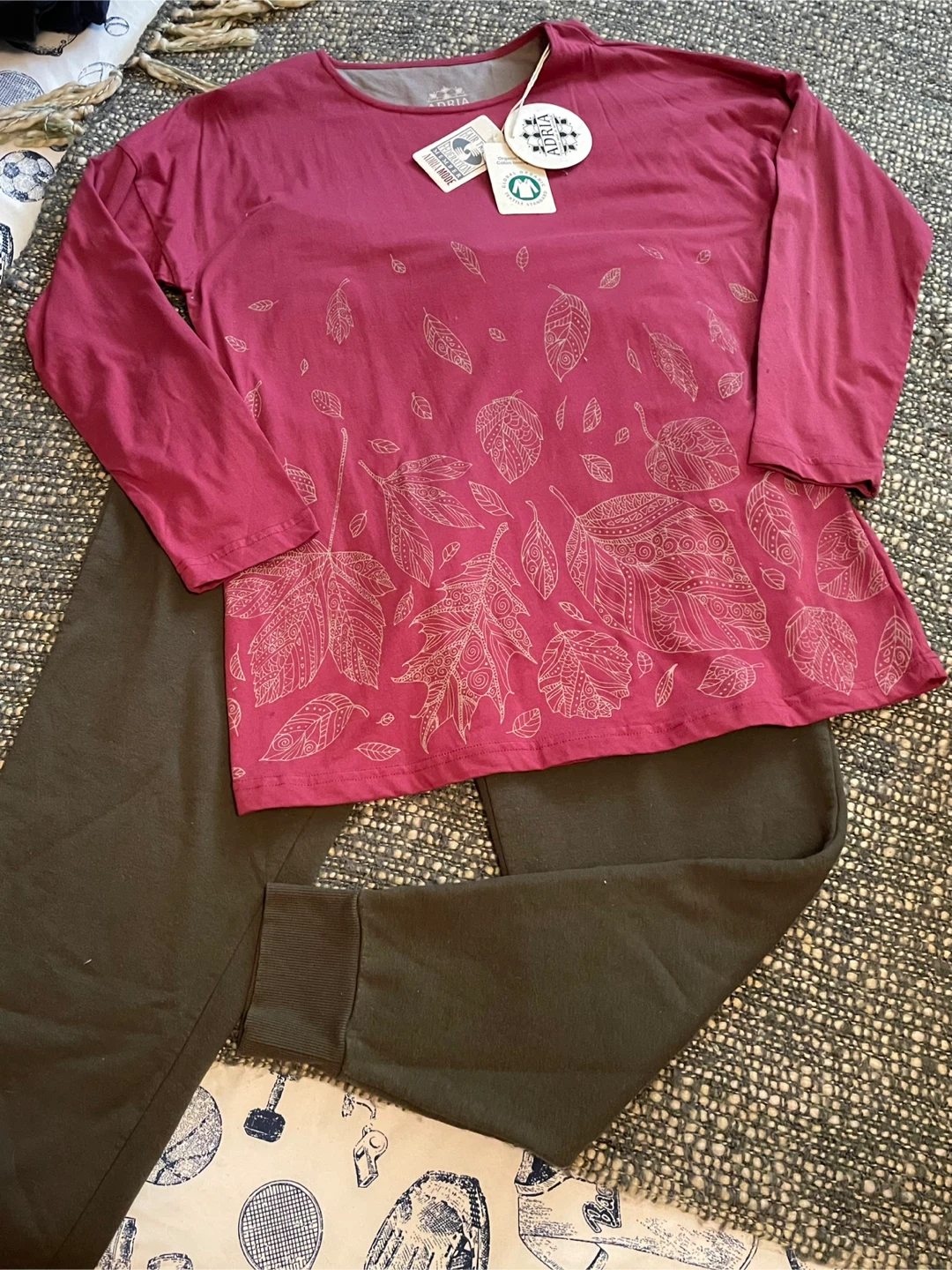 Cozy up in this brand new Adria 3/4 sleeve top. Made with organic cotton, it's super soft and comfy. The pink top features a lovely leaf design.