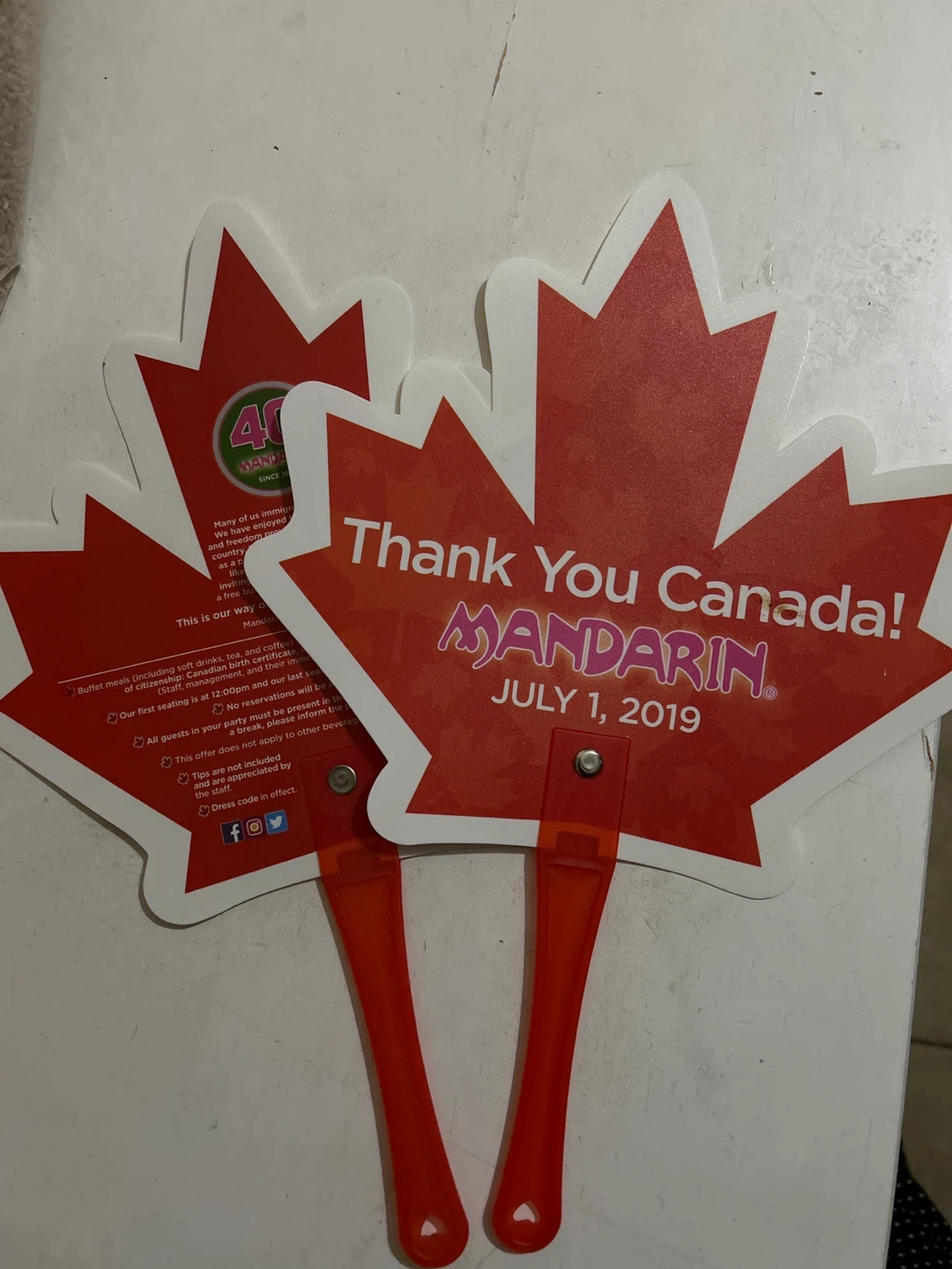 A fun souvenir from Mandarin, celebrating Canada Day! This maple leaf fan is a great way to show your Canadian pride. Perfect for collectors or anyone who loves a bit of Canadiana.