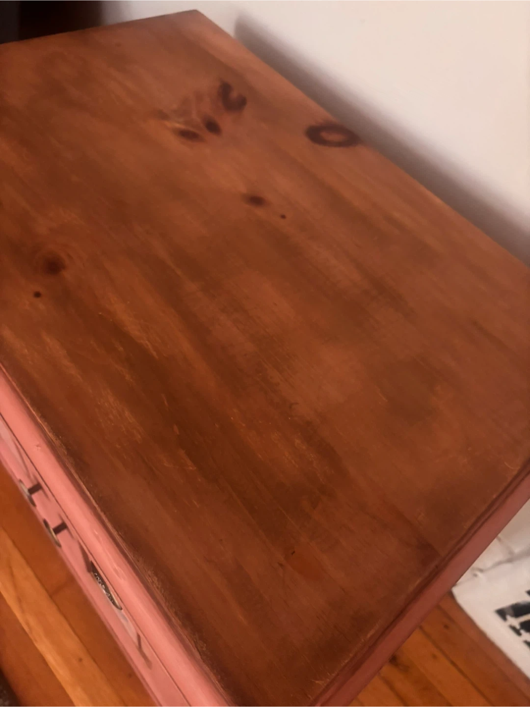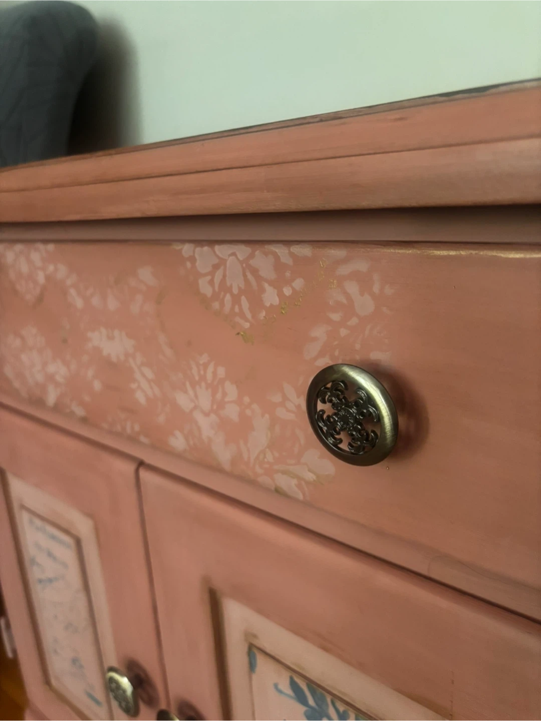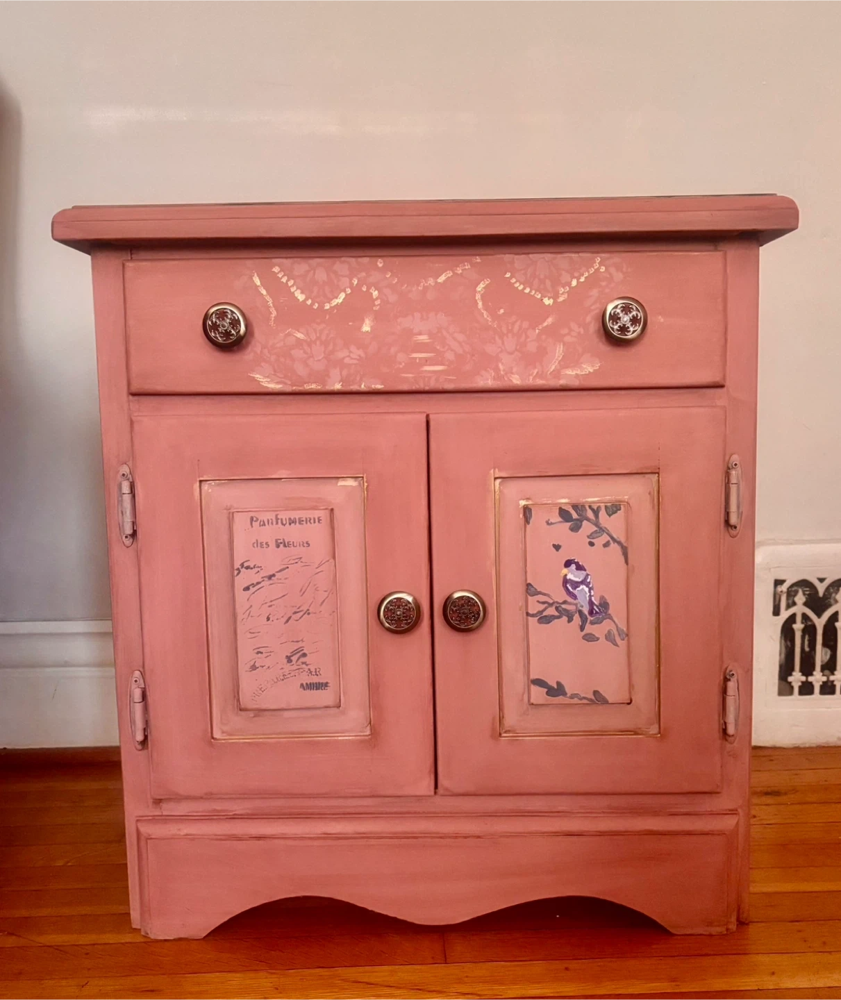 This charming accent cabinet features a drawer and two doors, perfect for adding a touch of vintage style to your home. The cabinet is painted in a lovely coral colour and has decorative details such as floral patterns and bird motifs. It would be a great addition to a living room, bedroom, or entryway!