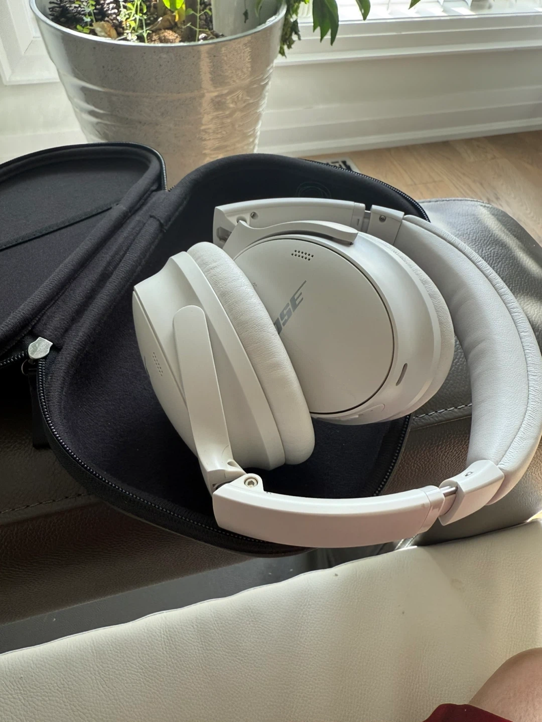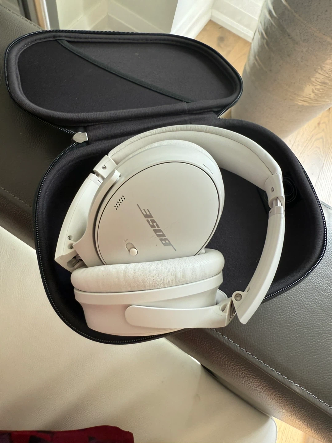 Selling a pair of Bose QuietComfort 45 headphones in white! They're in great condition and come with the original case. These headphones are known for their excellent noise cancellation and comfortable fit, perfect for travel or just relaxing at home