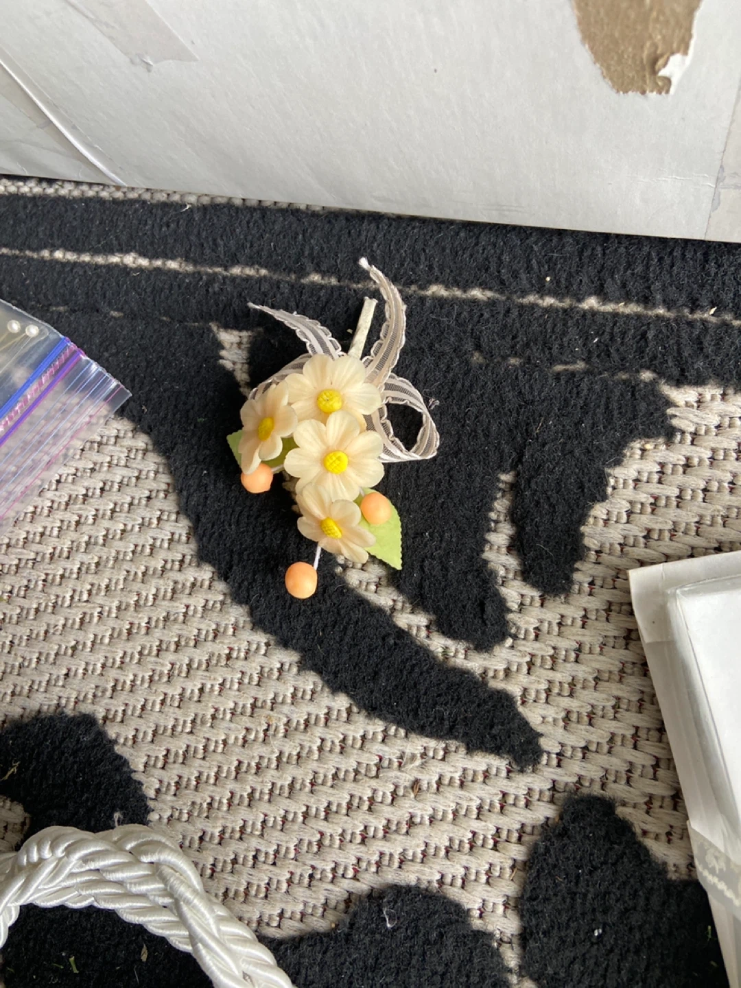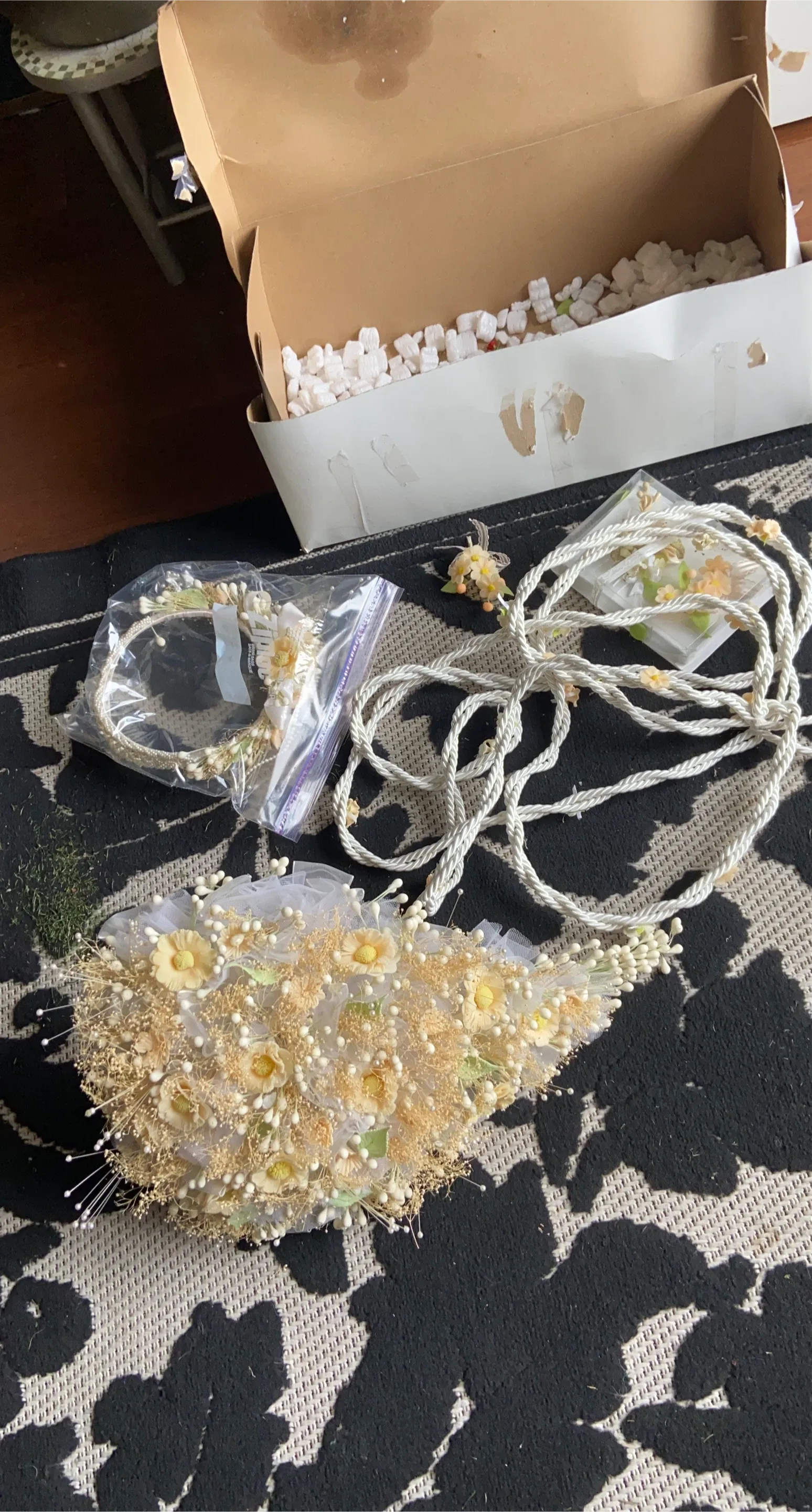 Selling a set of wedding floral accessories. Includes a floral headpiece, a bouquet, a rope, and other floral decorations. Perfect for adding a touch of elegance to your special day!