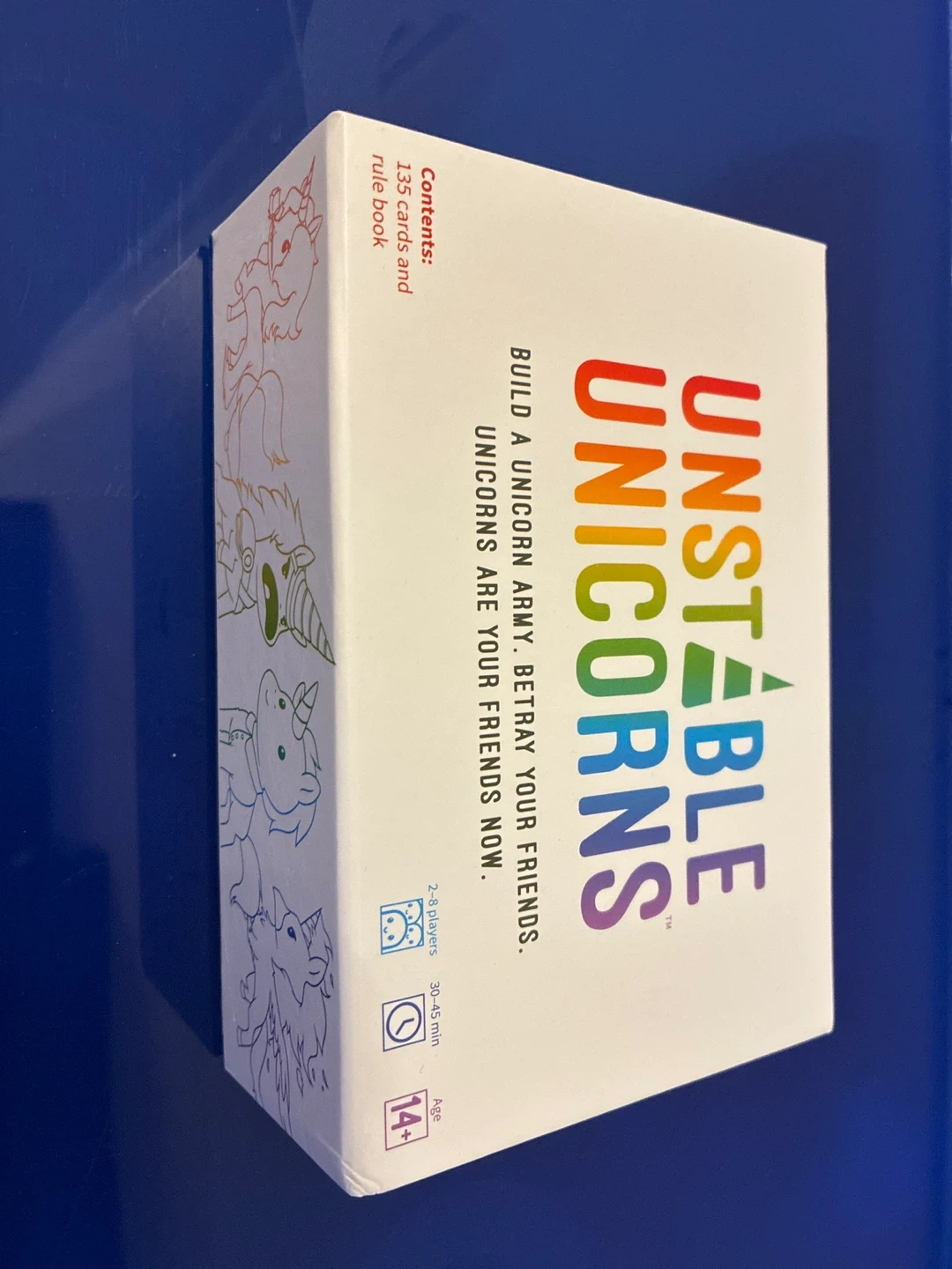 113Unstable Unicorns is a strategic card game that's all about building a unicorn army! Betray your friends, since unicorns are your friends now Contents: - 135 cards - Rule book It's designed for 2-8 players, with a playtime of 30-45 minutes, and recommended for ages 14+
