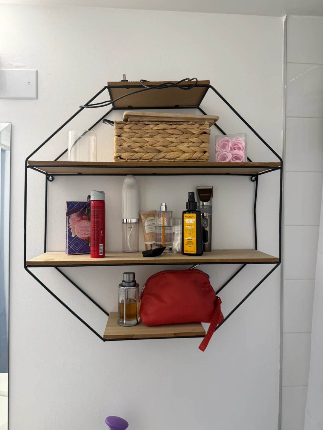Here's a wall-mounted shelf, perfect for adding some storage and style to your space! It features a unique geometric design with wooden shelves and a black metal frame. Great for displaying your favourite items or organizing essentials