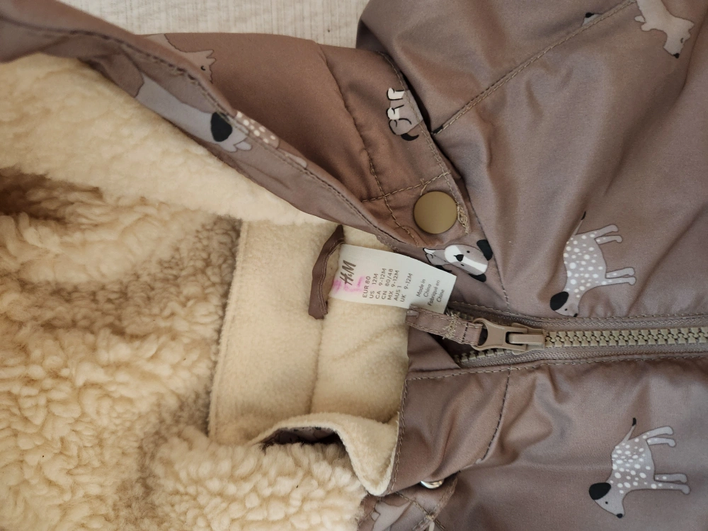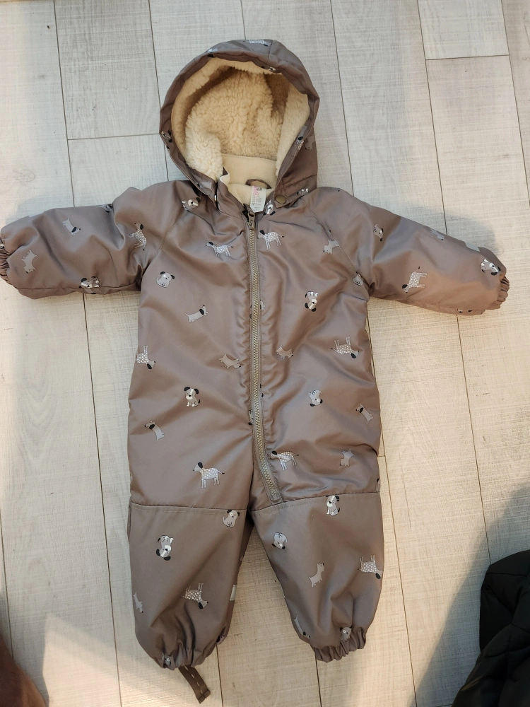Cozy H&M snowsuit in size 80! It's a lovely brown colour with an adorable animal print. The inside is lined with a soft, warm material, perfect for keeping your little one snug during the colder months