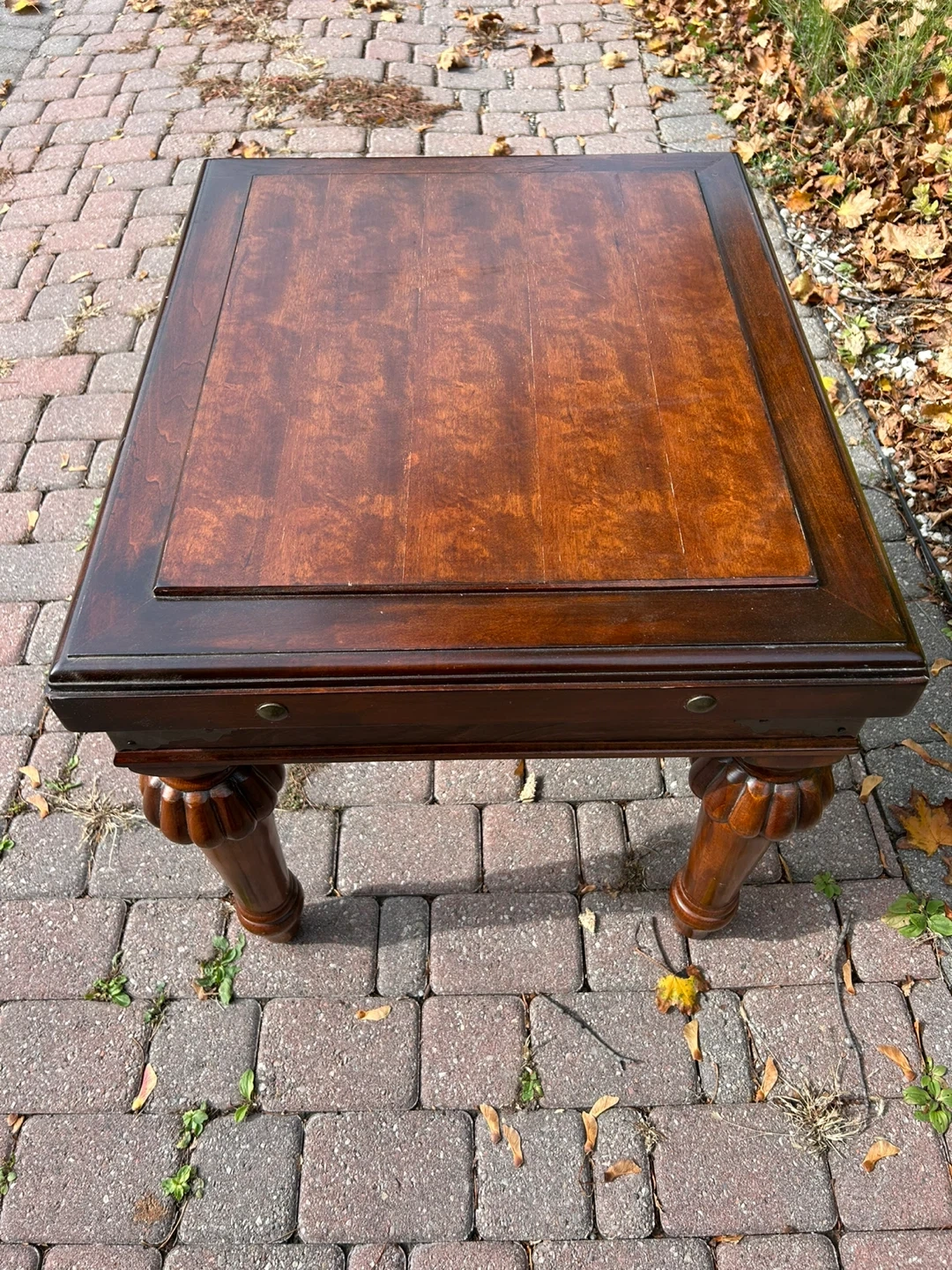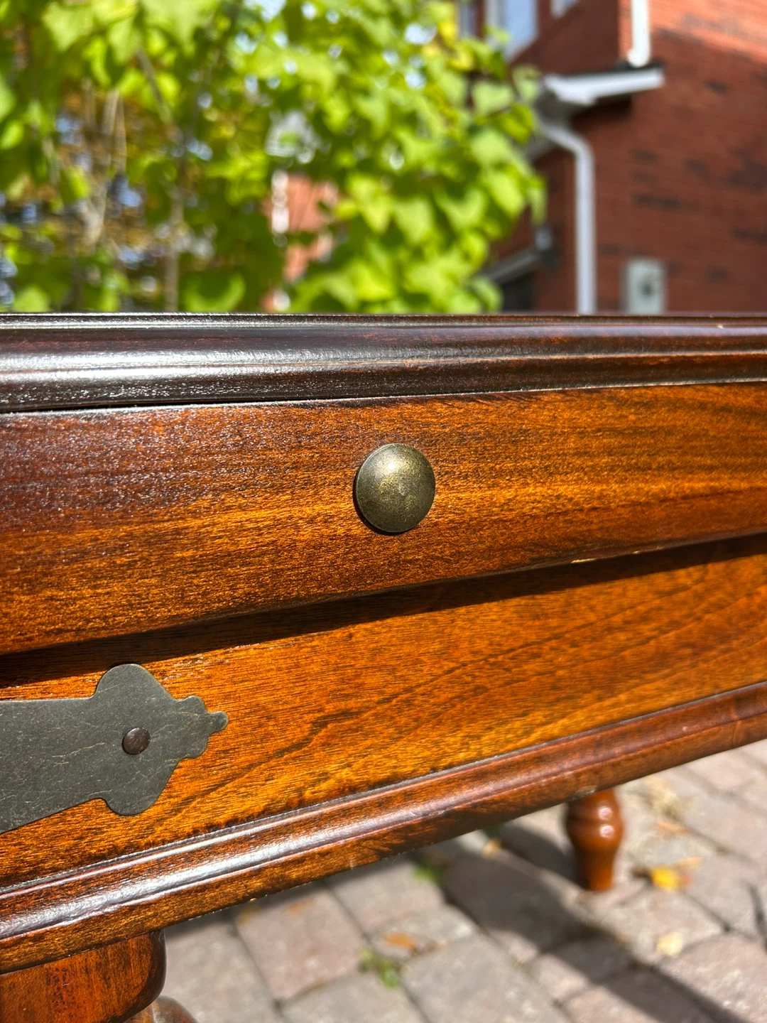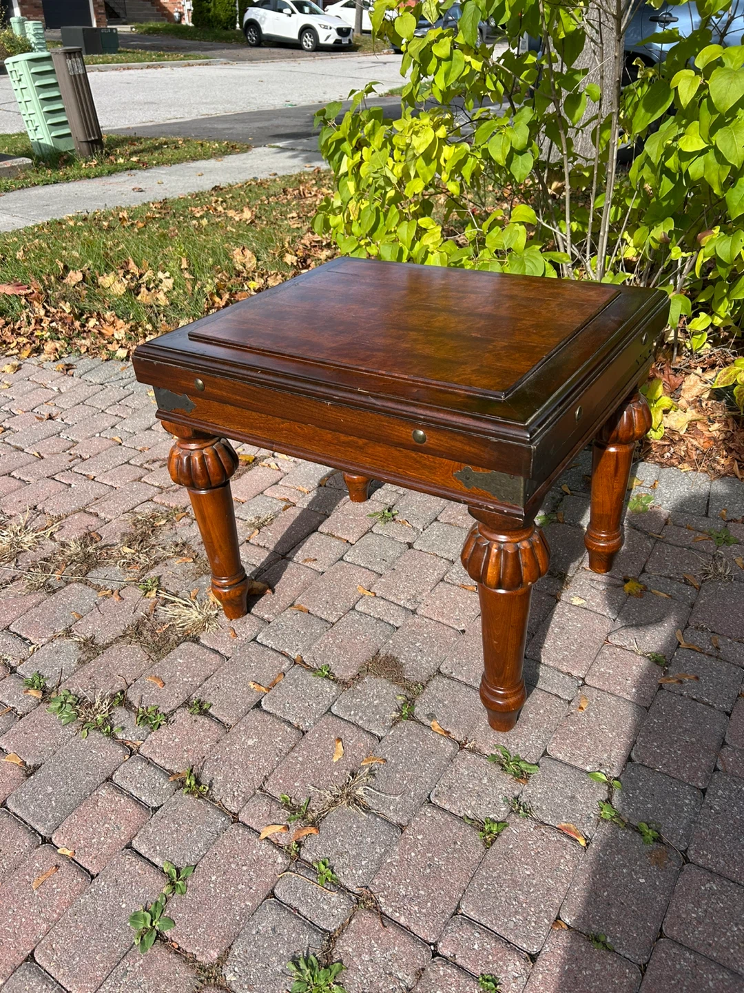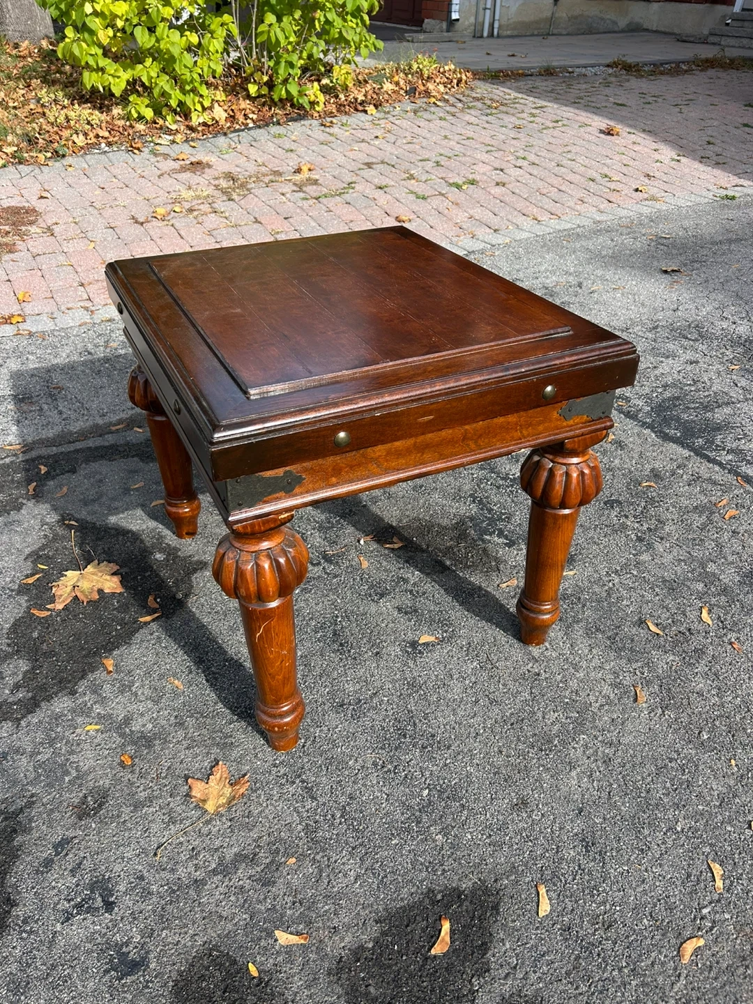 This is a beautiful brown wood end table with decorative metal accents. It has a sturdy construction and a unique design for your home or office.