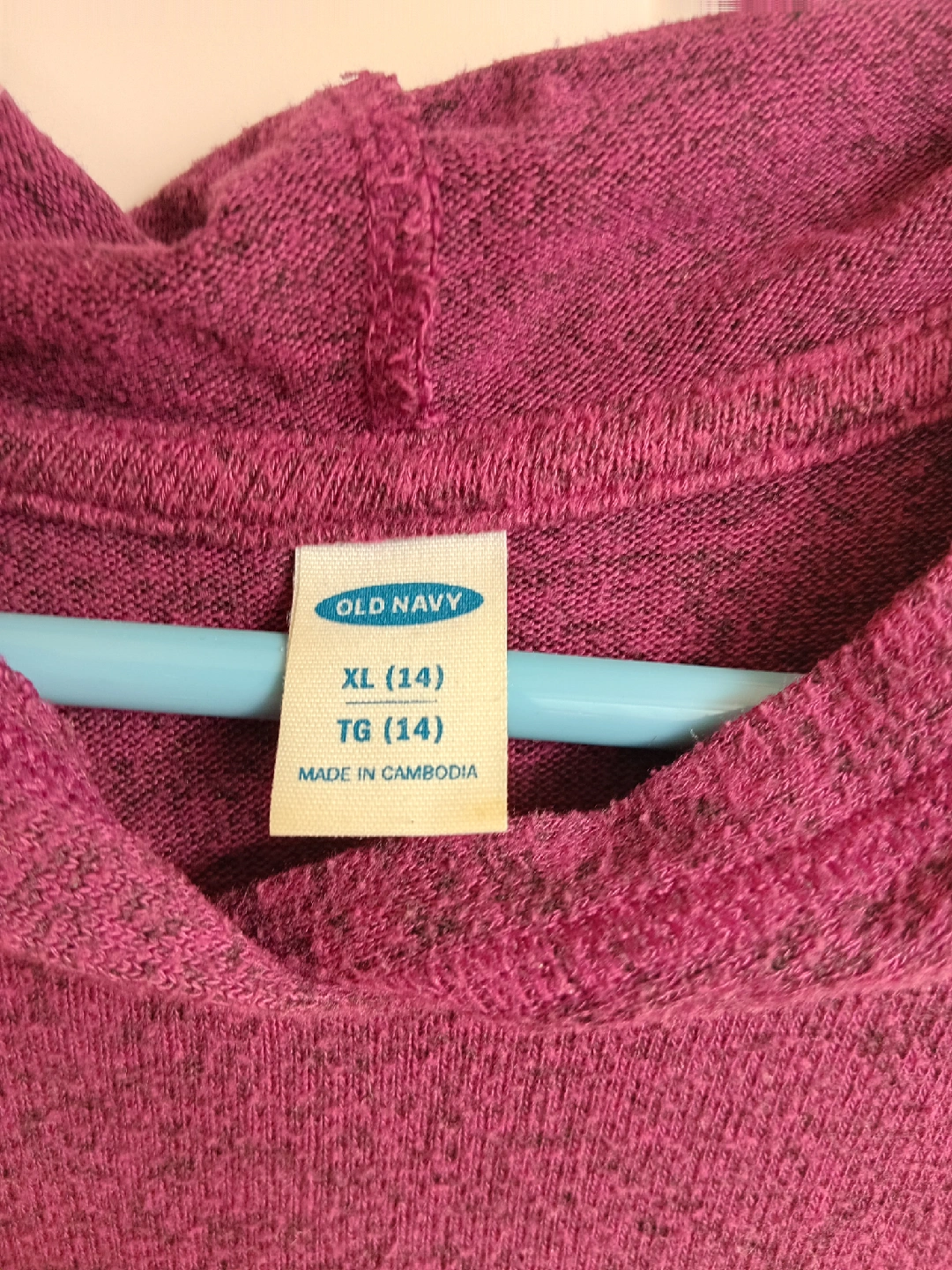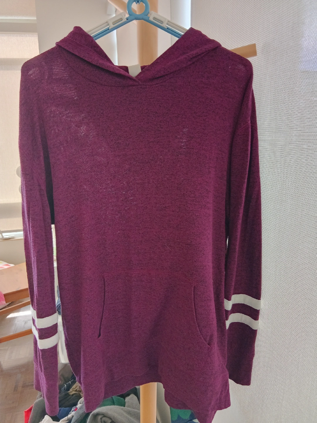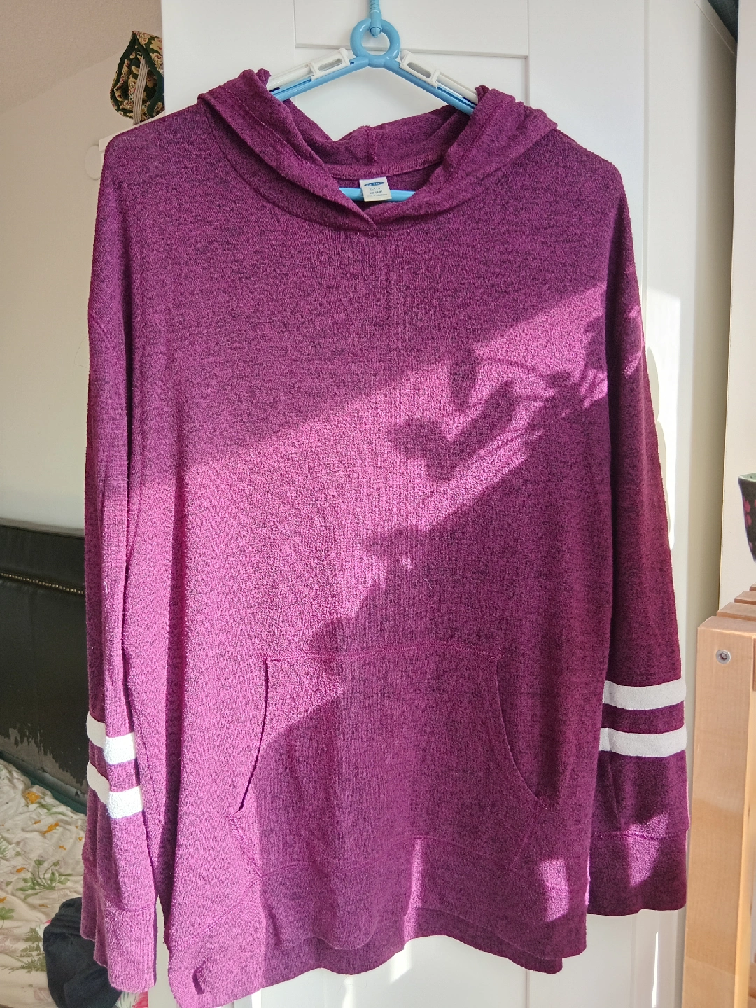 Selling a comfy Old Navy hoodie in a lovely shade of purple! It's a size XL (14) and features a hood and a kangaroo pocket. The sleeves have white stripes, adding a sporty touch. Perfect for cozy days!