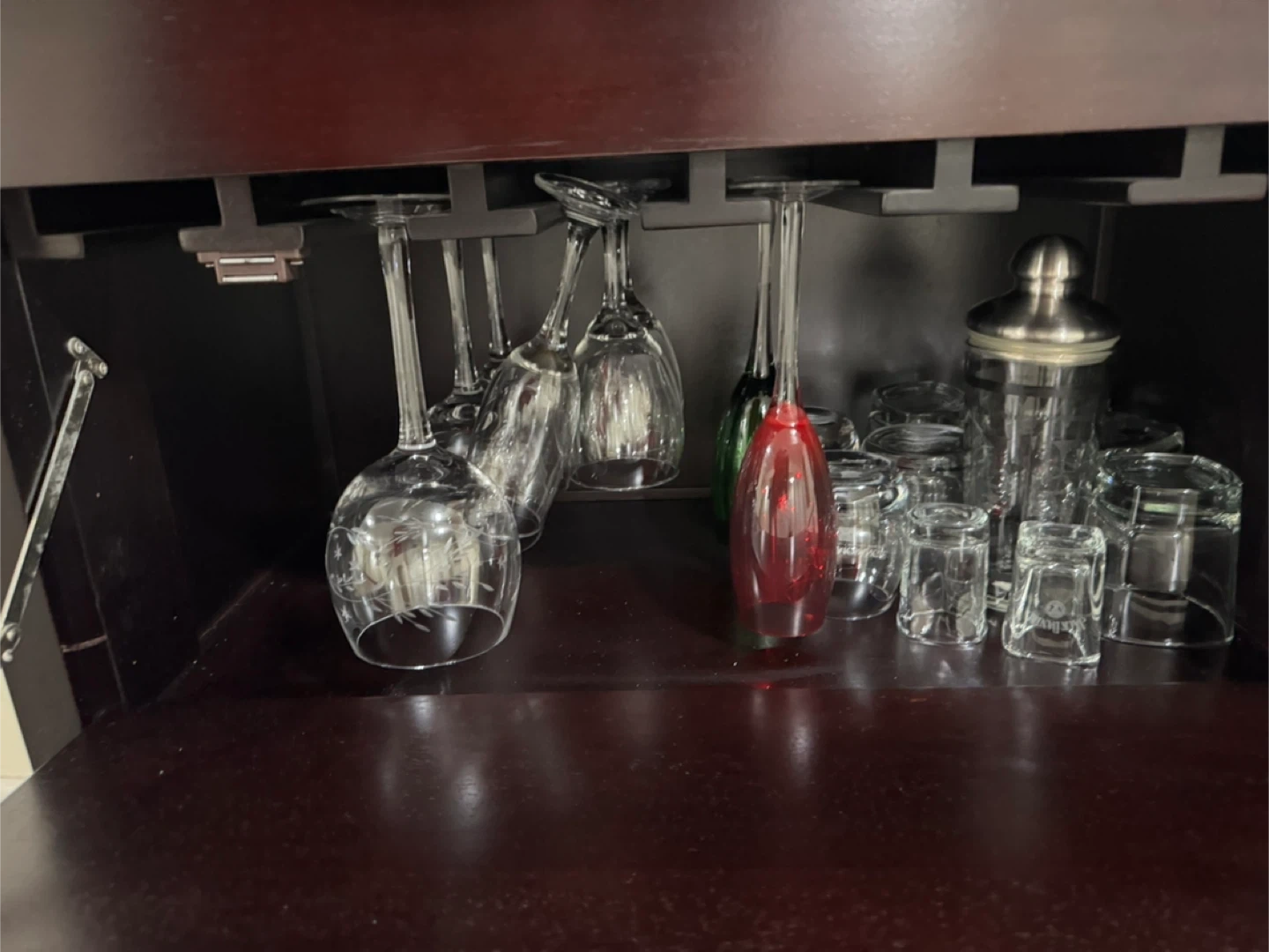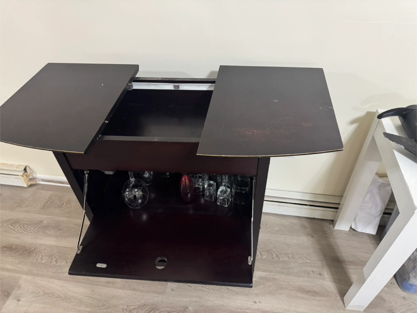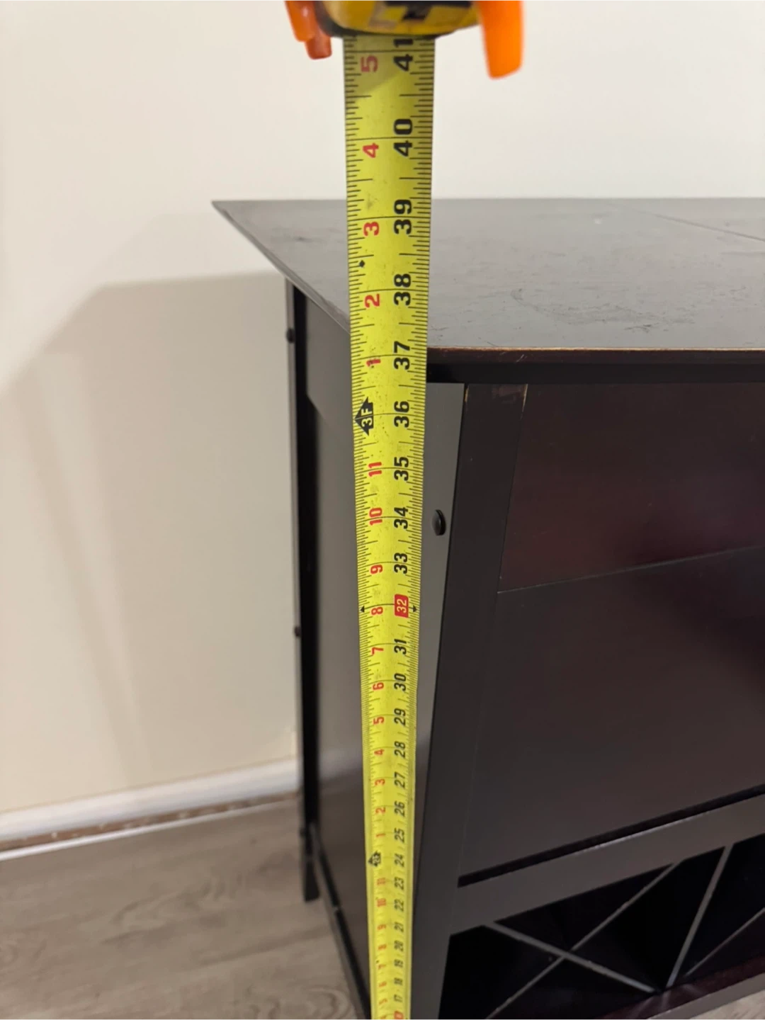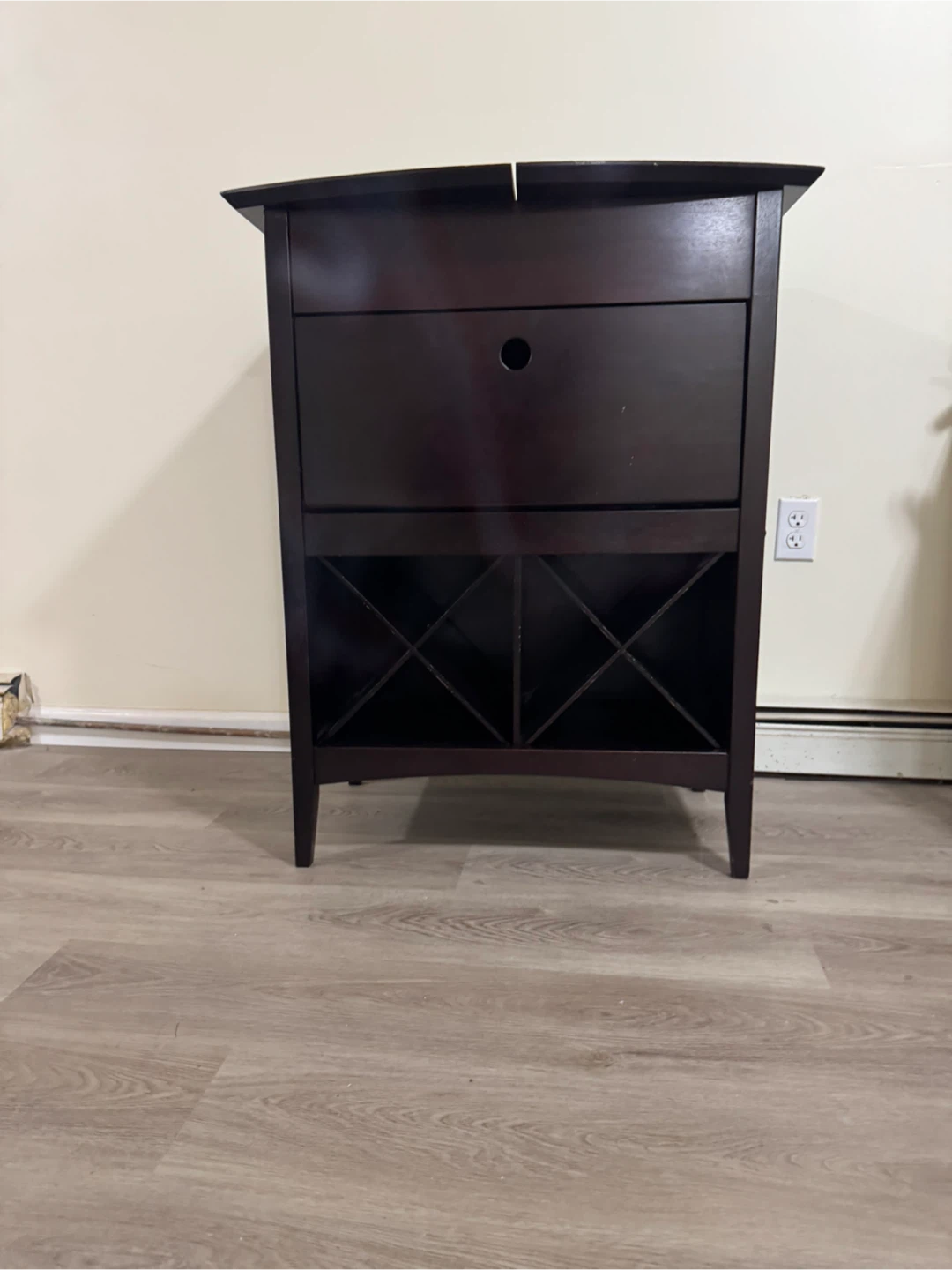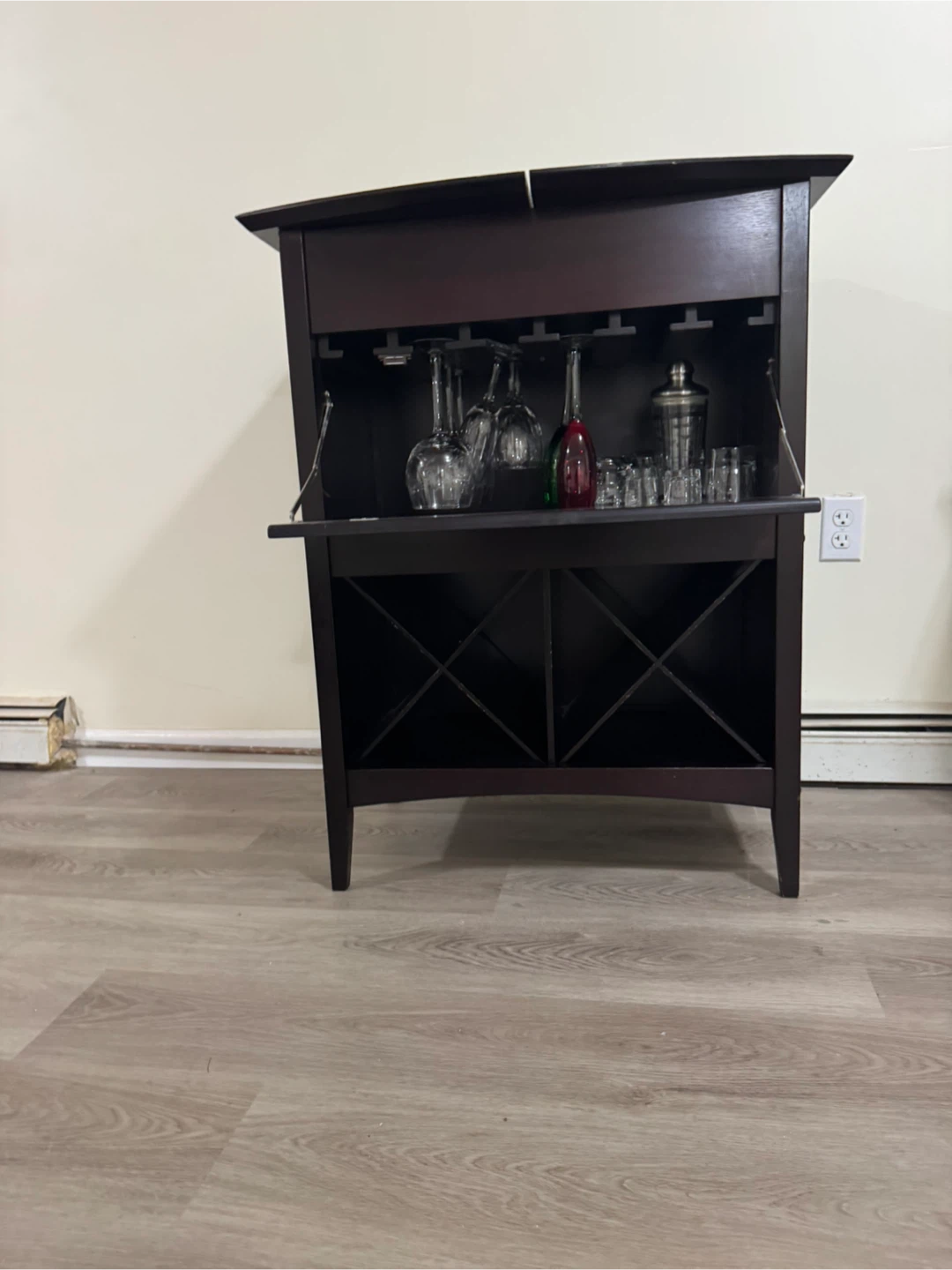 I'm selling a dark brown bar cabinet! It features a wine rack at the bottom and storage for glasses and bar tools up top. It's about 40 inches tall and 30 inches wide. Solid wood very nice piece.