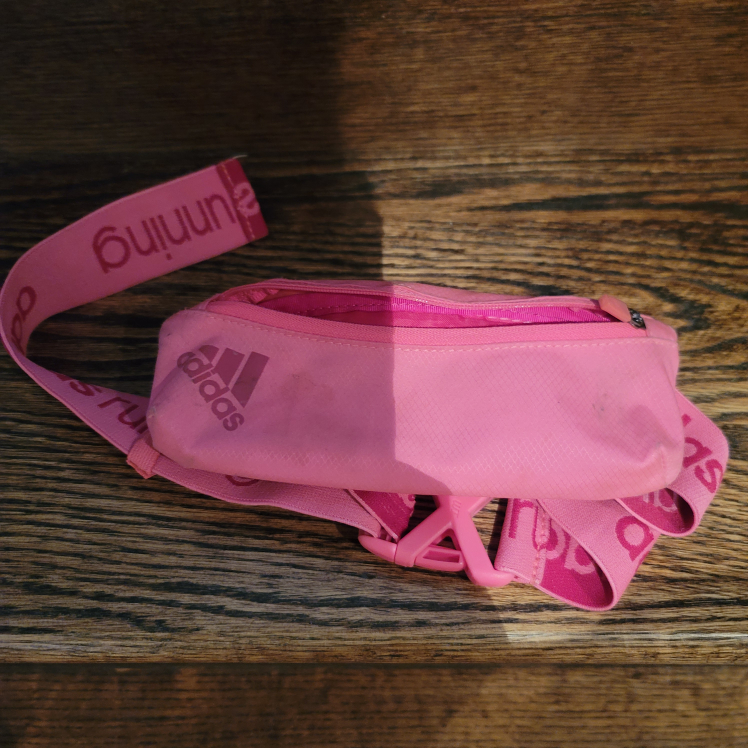 A pink Adidas running belt! It's perfect for holding your essentials while you're out for a run. It has the Adidas logo on the front and 'running' printed on the strap.