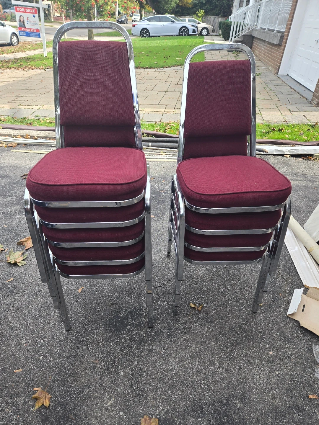 Selling some burgundy and chrome stacking chairs! 9 in total, they're in good condition some have faded writing as they were school chairs. Perfect for extra seating or events.