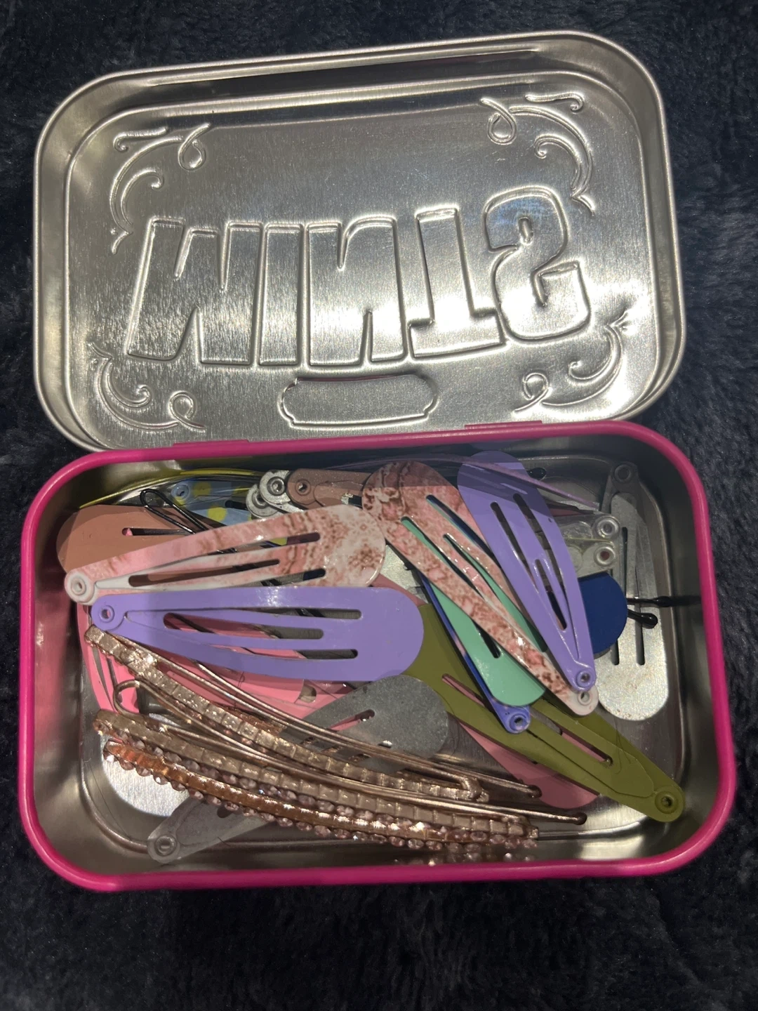 23Here's a cute little tin filled with assorted hair clips! There are various colours and styles, perfect for adding a little flair to your hair. They're in great shape and ready for a new home