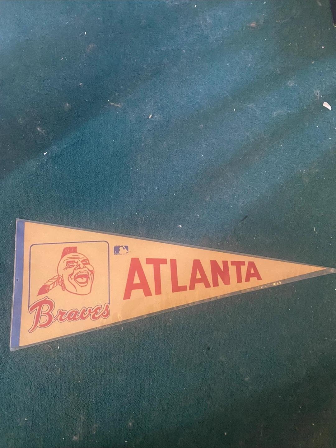 36Selling a Vintage Atlanta Braves pennant! It features the Braves logo and the word 'Atlanta' in red lettering. Perfect for any Braves fan! Protective sleeve 12” x 30”