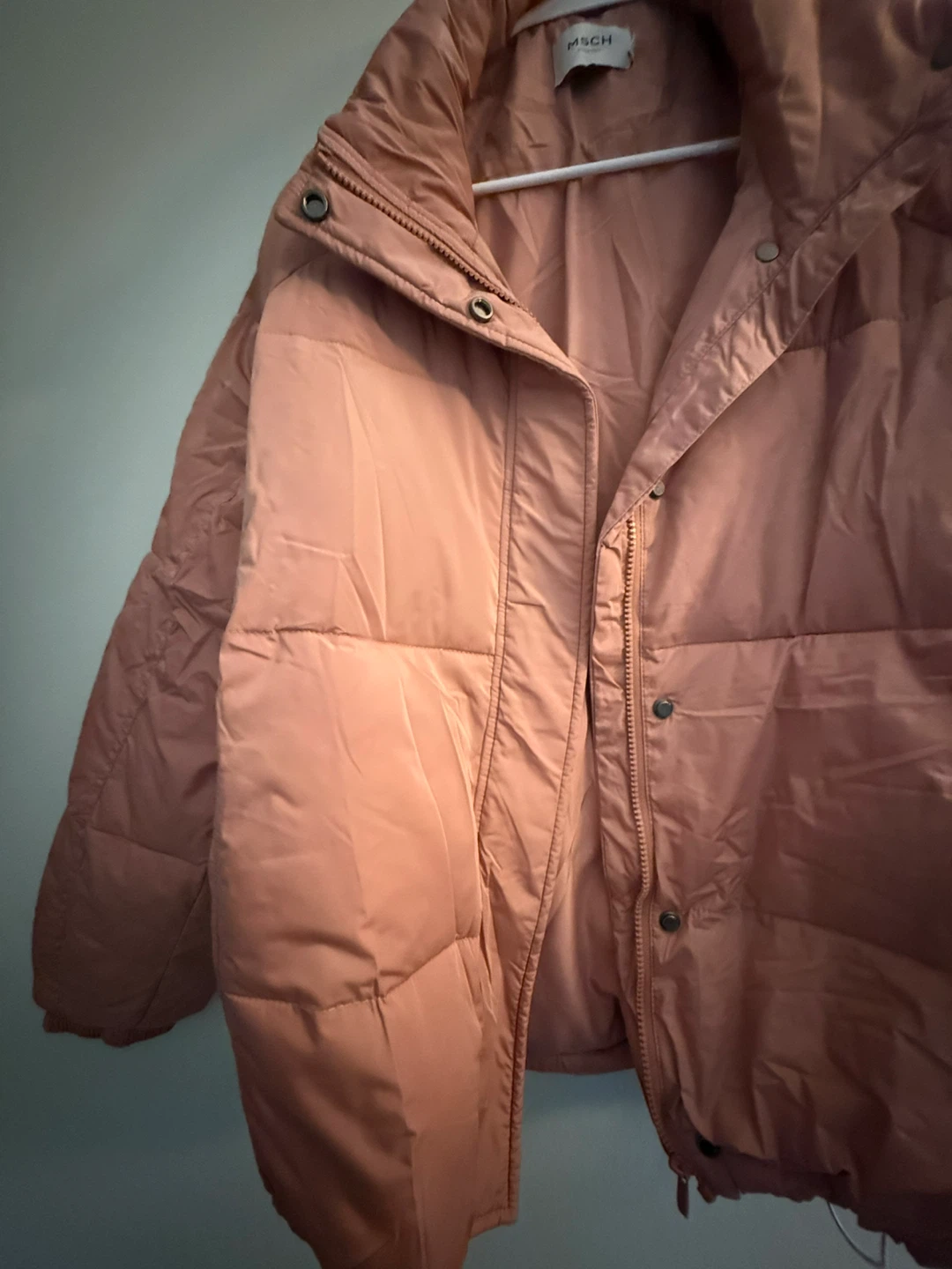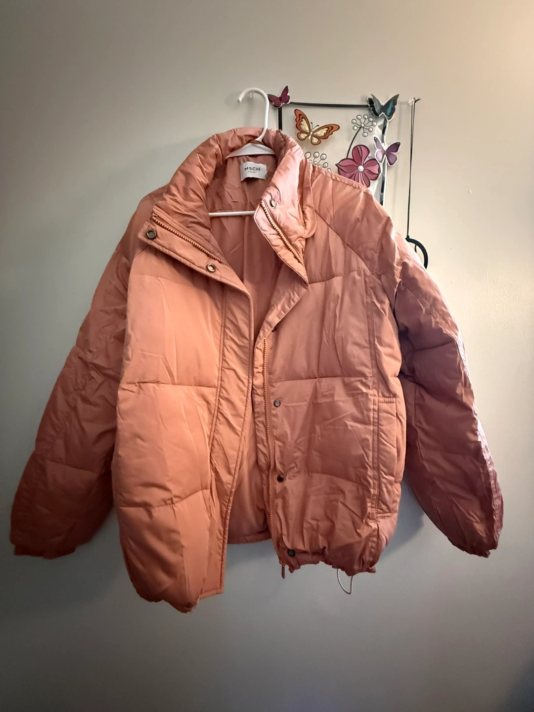 Cozy MSCH Copenhagen puffer jacket in a lovely salmon colour! Perfect for staying warm and stylish during the colder months. It's in great condition and ready for a new home