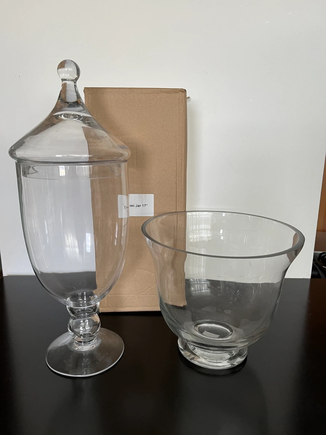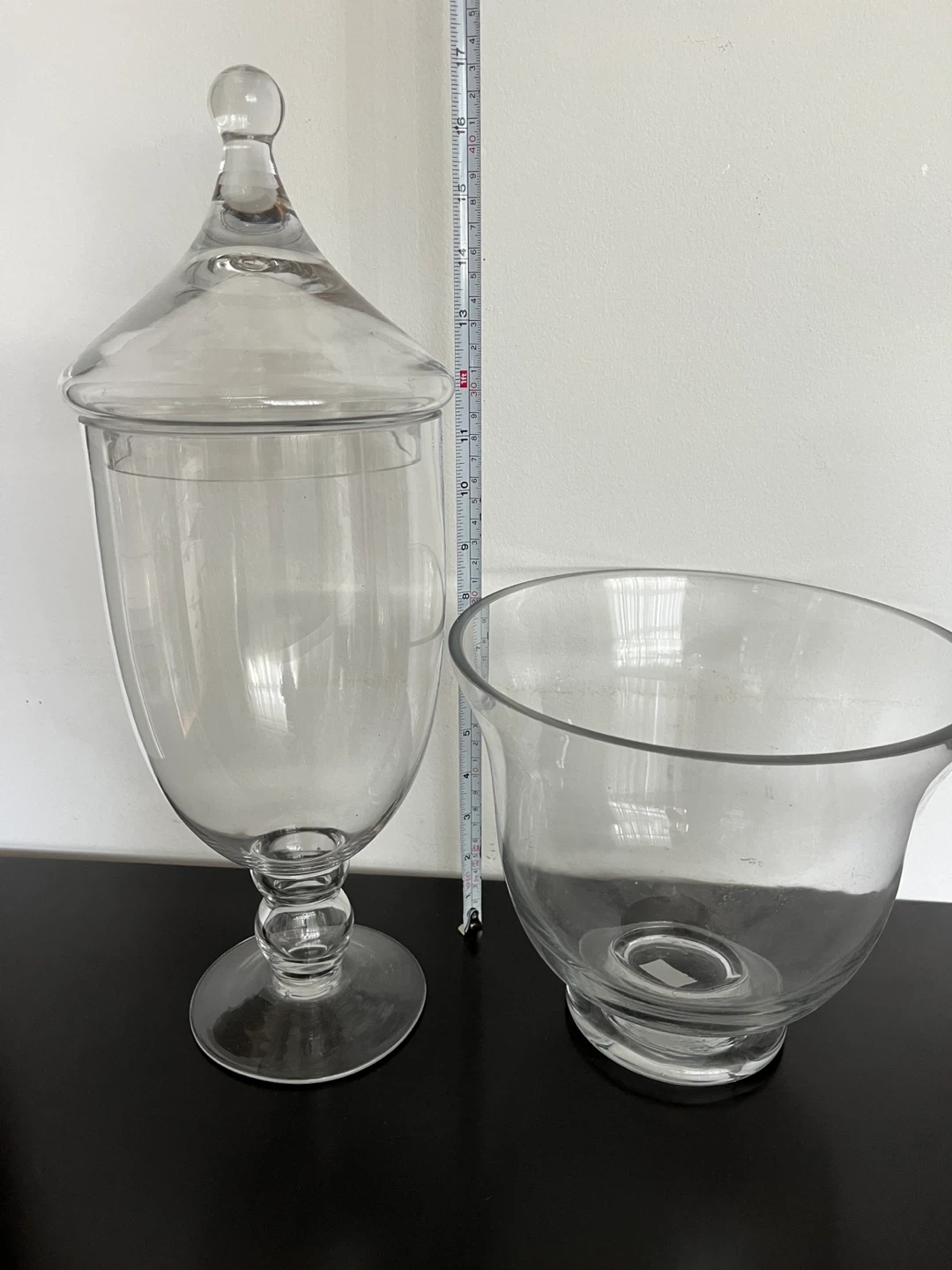 Clear glass canister jar and bowl set. The jar is about 17 inches tall. Perfect for displaying fruit or other decorative items.