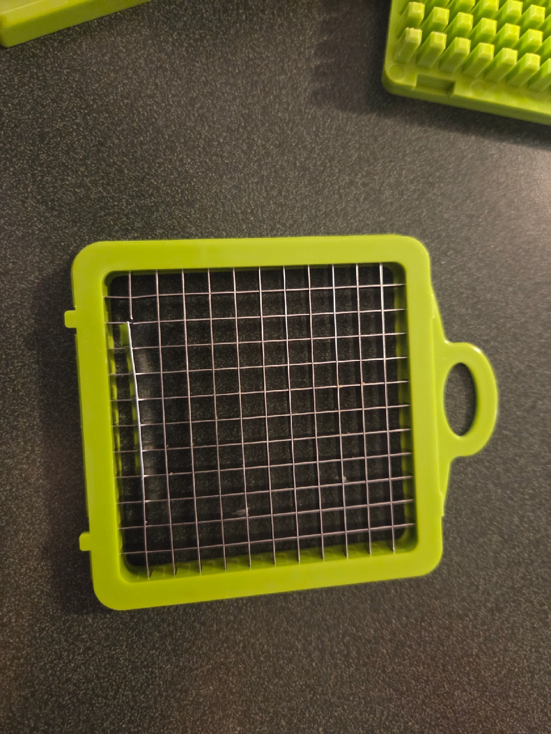 Free vegetable chopper and slicer! It's in great shape and comes with multiple interchangeable blades for different cuts and sizes. Missing the large square chopper blade and the small square chopper blade is slightly damaged but still works. Makes meal prep a breeze!