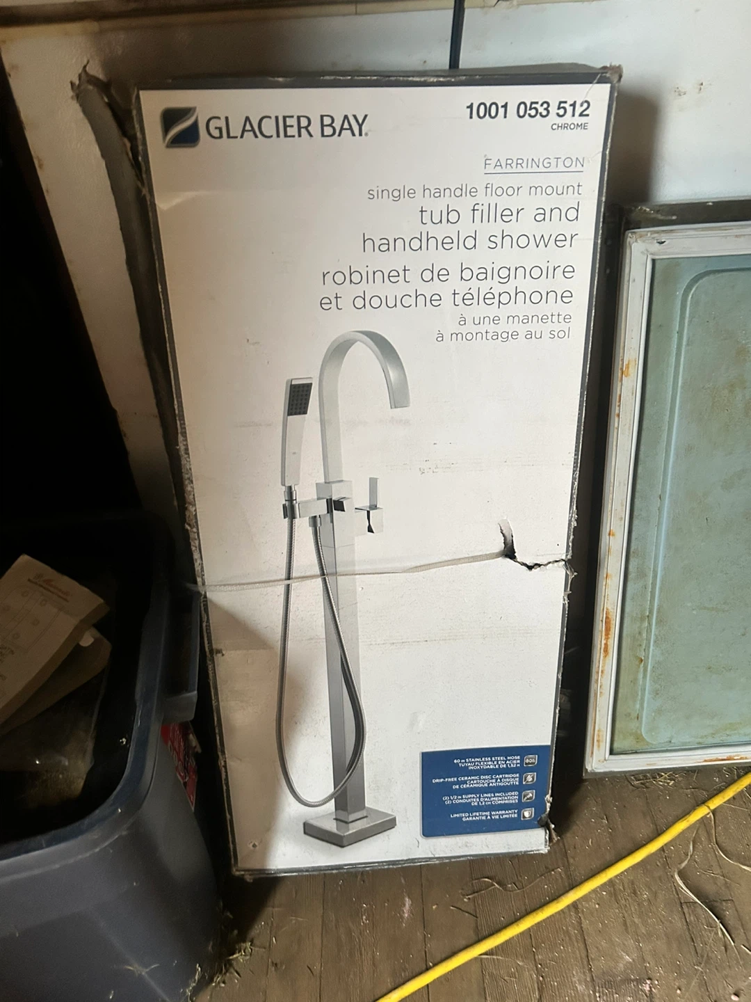 Selling a Glacier Bay Farrington single handle floor mount tub filler and handheld shower in chrome. It's still in the box and ready for your bathroom renovation!
