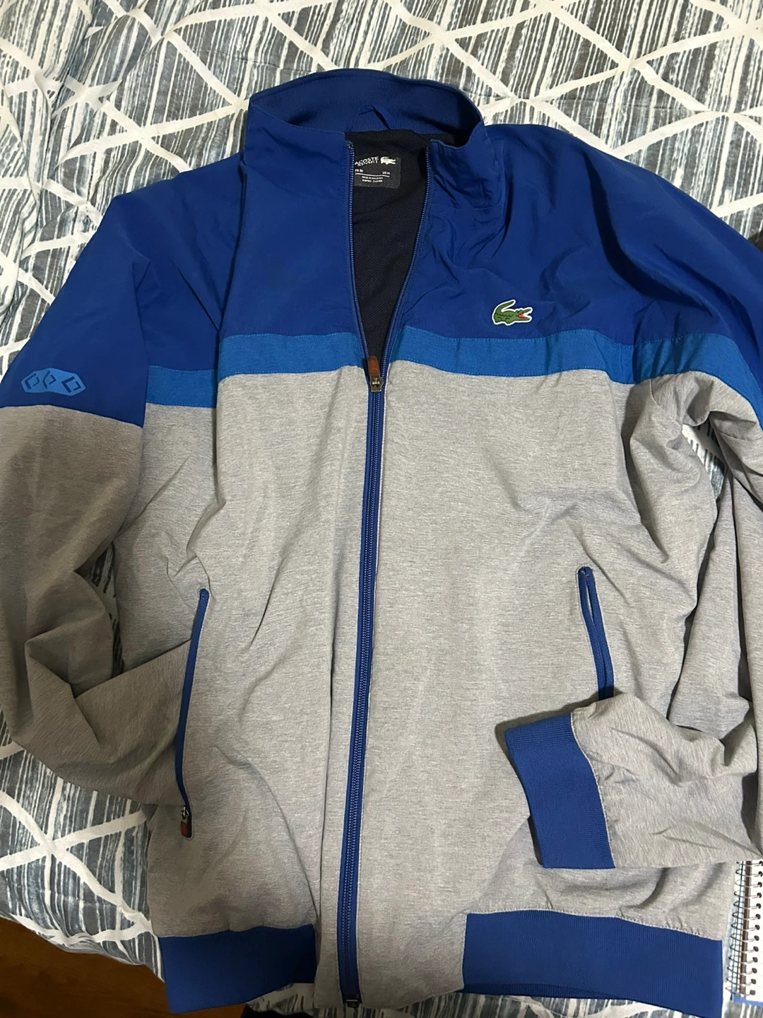 65Selling a Lacoste colourblock zip jacket in great condition! It features a stylish design with blue and grey colour blocking. Perfect for layering or wearing on its own. Size medium. Pick up Acton