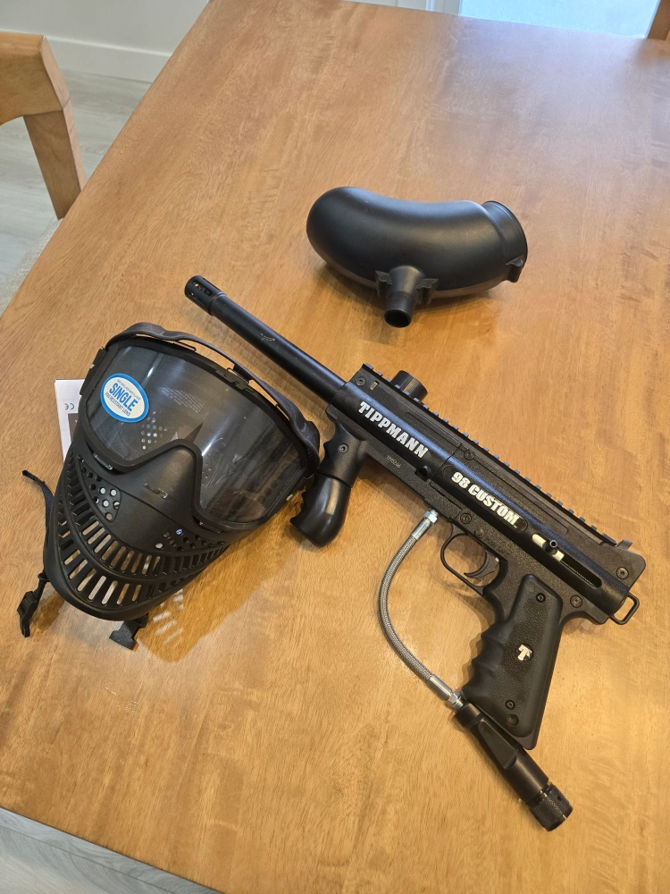 Selling a Tippmann 98 Custom paintball gun. It also comes with a mask and hopper. Great for getting into paintballing! The plastic lid needs to be replaced.