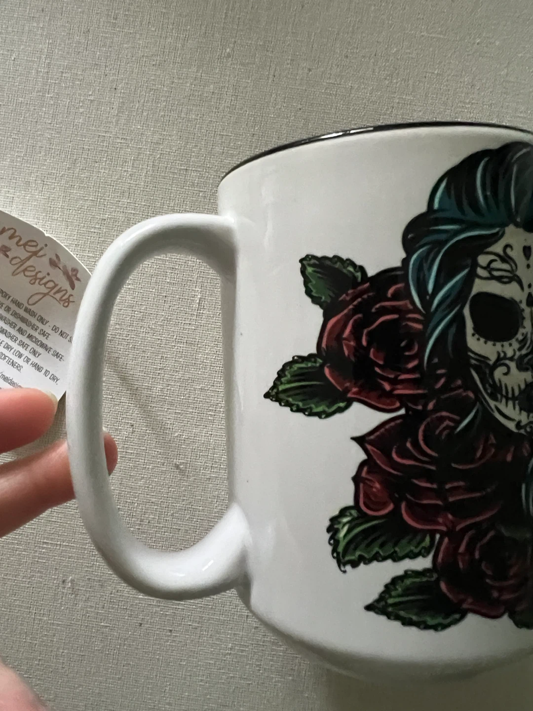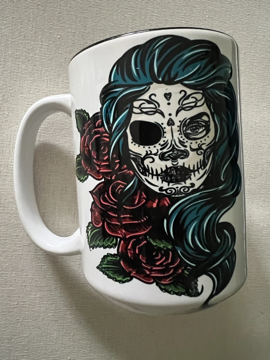 Here's a unique coffee mug featuring a Day of the Dead sugar skull design with roses. It's white with a black interior and trim. It measures approximately 4.75 inches tall. Perfect for adding a bit of spooky flair to your morning coffee!