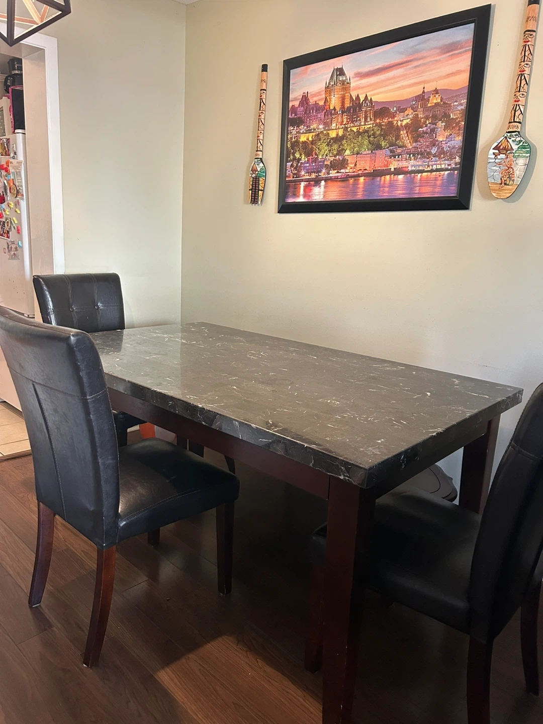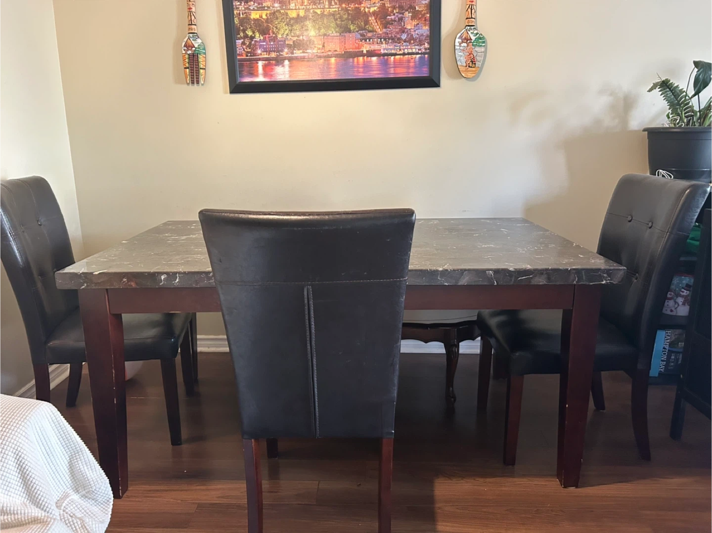 Selling a dining table with four chairs. The tabletop has a dark marble pattern and the chairs are dark with buttoned backs. It's a great set for a small dining area or kitchen!