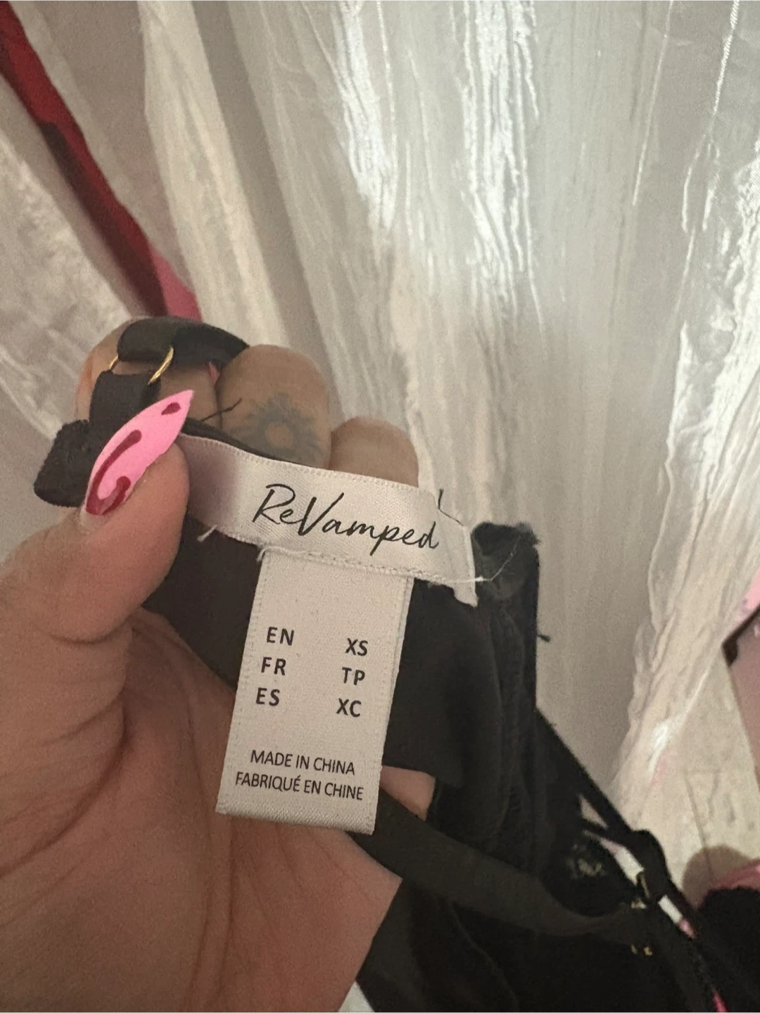 259Selling a cute black cami from ReVamped! It's a size XS and features delicate lace detailing. Perfect for layering or wearing on its own. It's in great condition and ready for a new home!