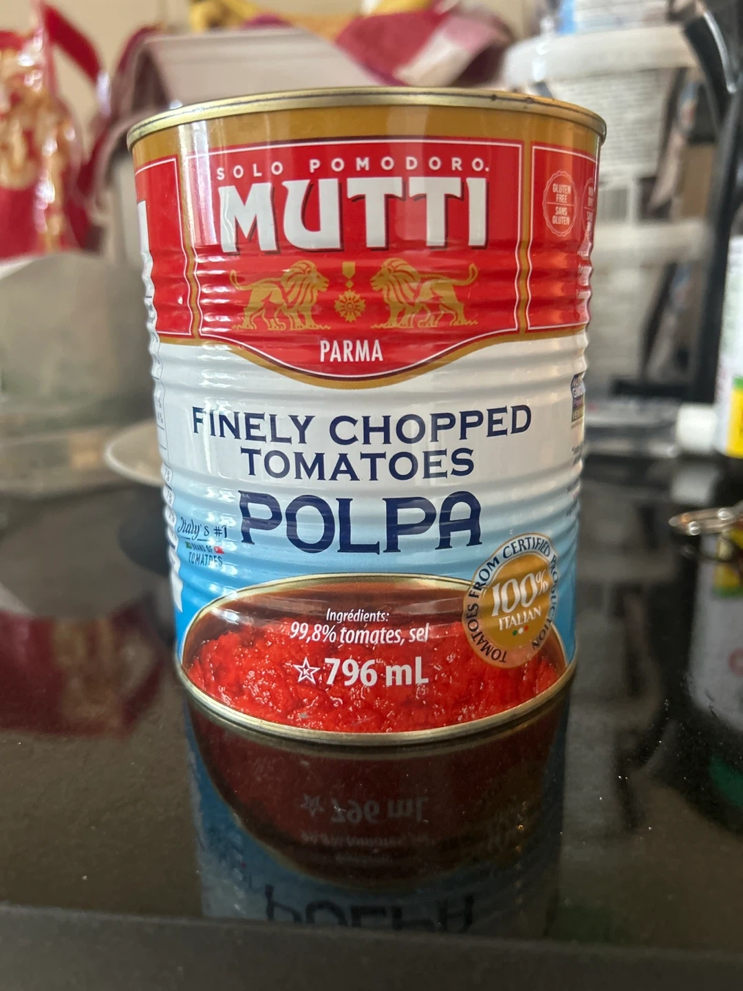 Selling a can of Mutti Finely Chopped Tomatoes Polpa. It's a 796mL can of 100% Italian tomatoes. The expiration date is 2026 August 31