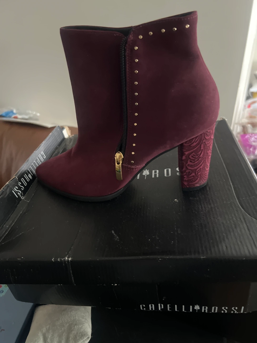 Selling a pair of Capelli Rossi ankle boots in a beautiful burgundy colour. These boots feature a unique patterned heel and a side zipper for easy wear. They come with the original box, so they're well-protected!