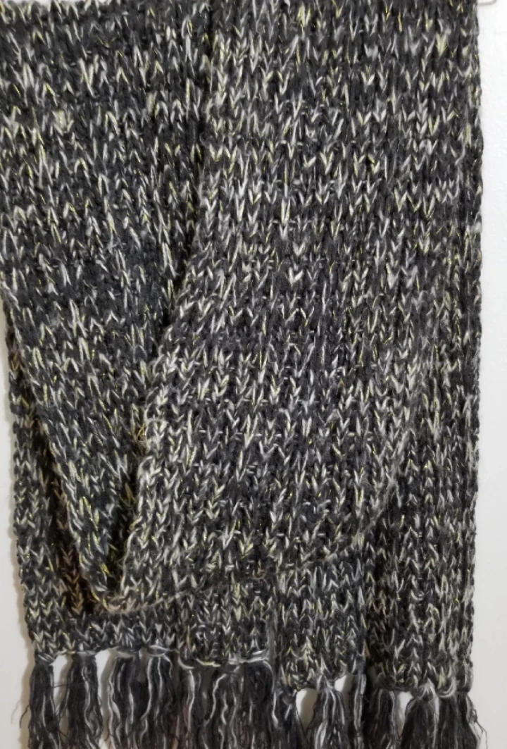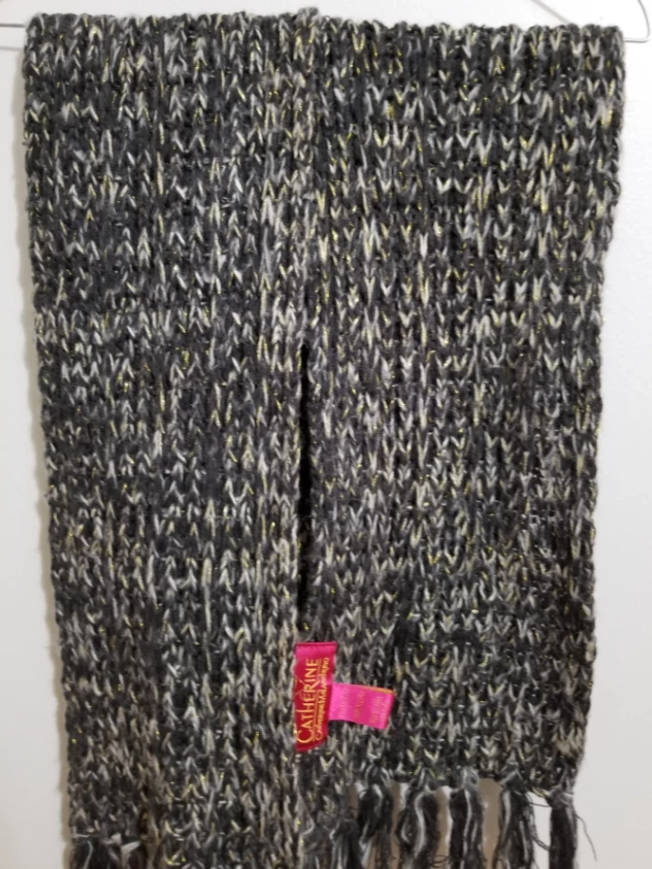 Cozy and stylish Catherine Catherine Malandrino scarf. It features a beautiful blend of gray, white, and gold threads, adding a touch of sparkle to any outfit. Perfect for staying warm during the cooler months!