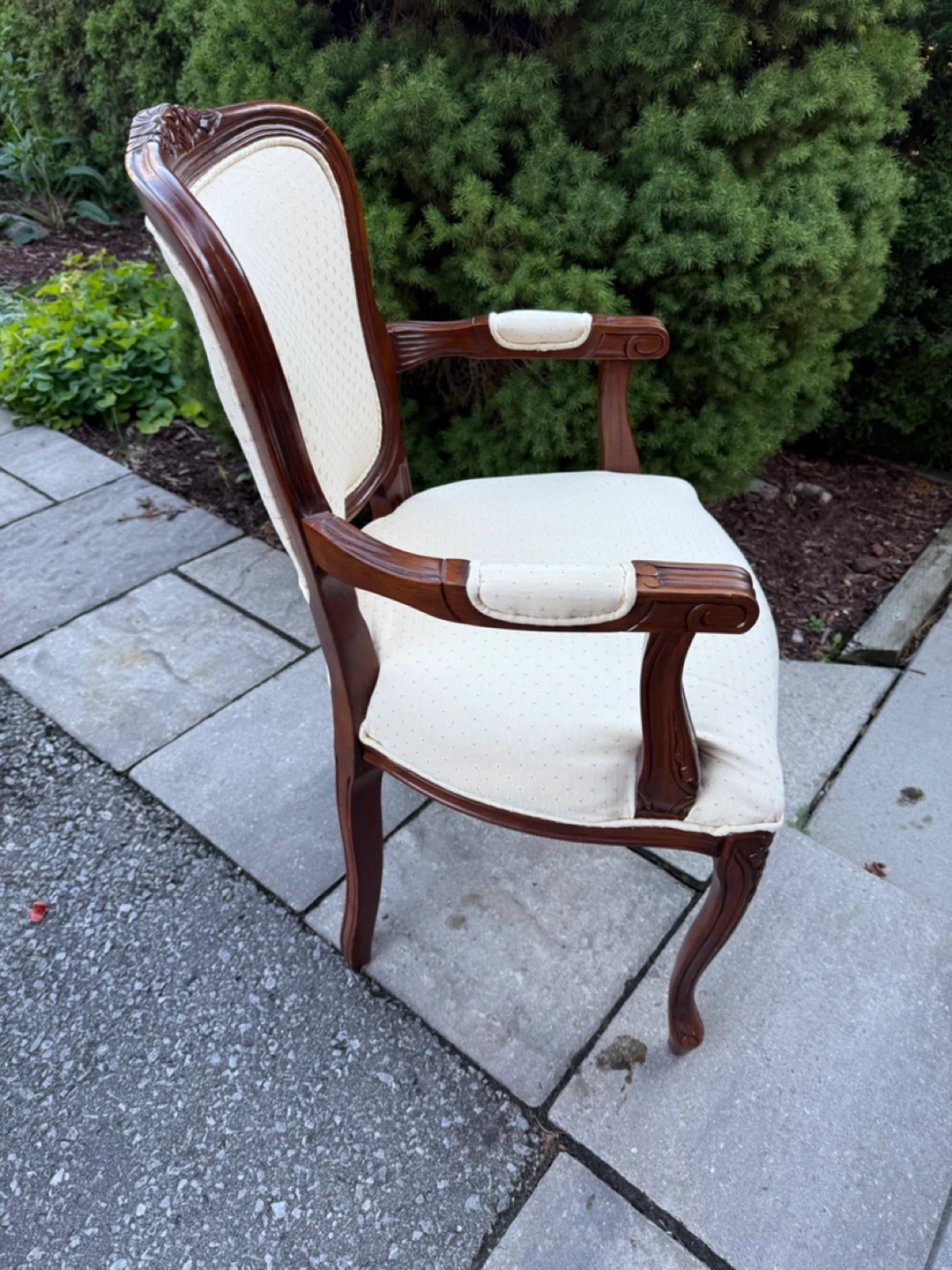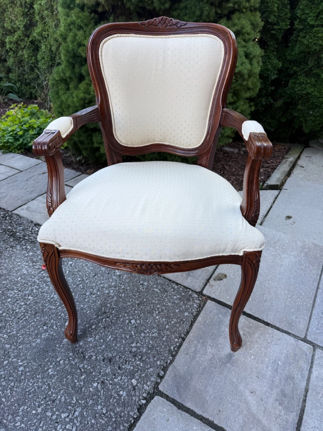 10Selling a lovely armchair with a classic, antique-inspired design. It features a cream-coloured, patterned fabric seat and back, complemented by a dark wood frame. Perfect for adding a touch of elegance to any room!