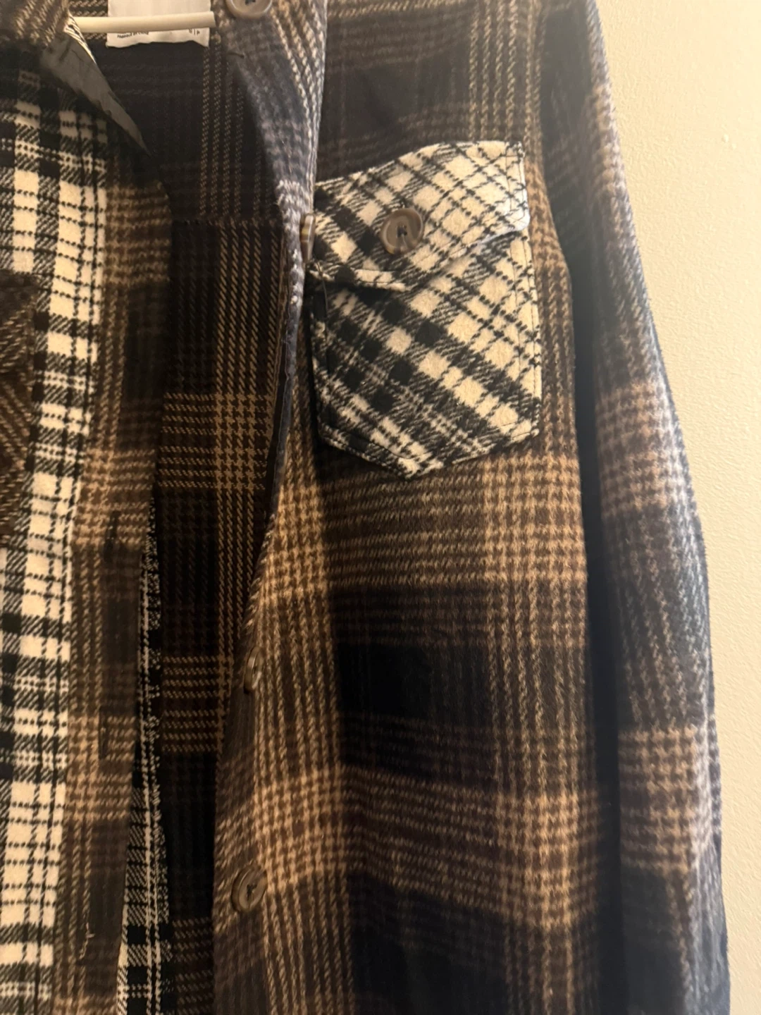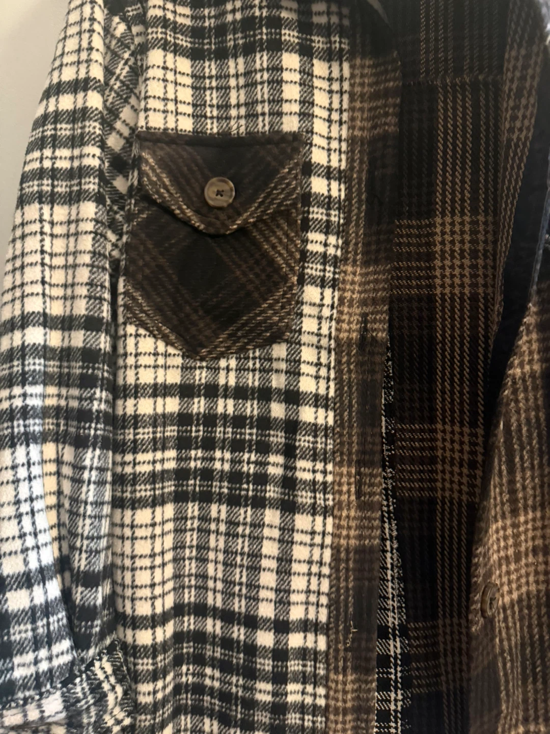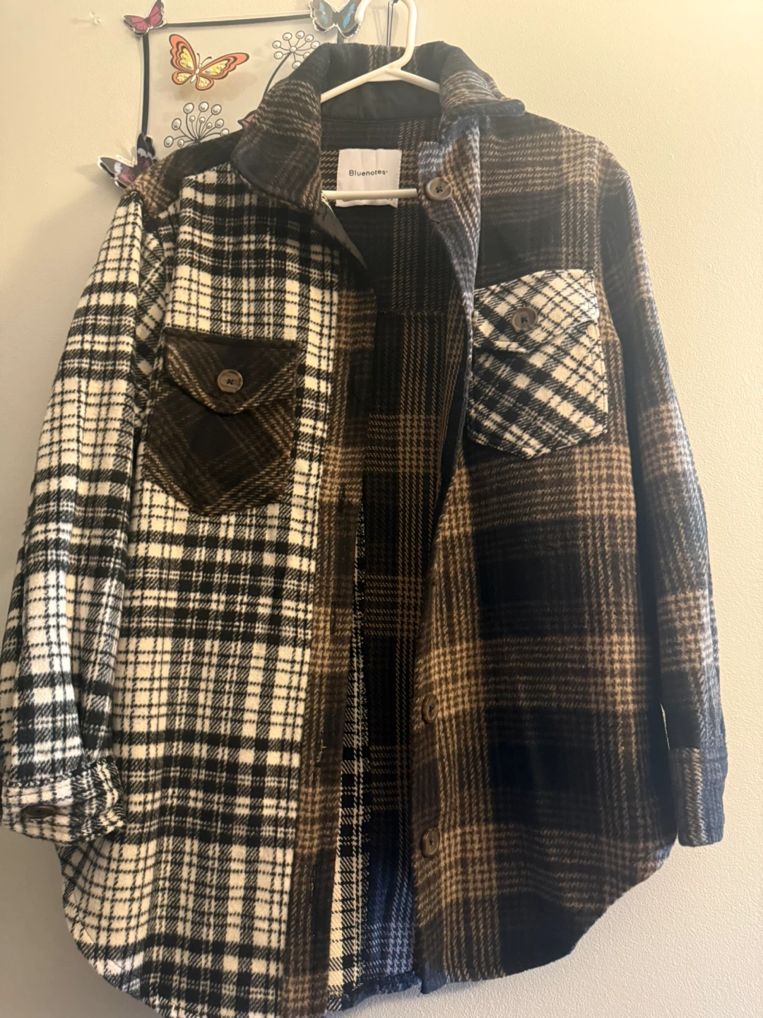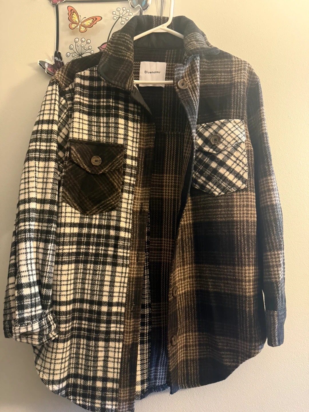 Cozy Bluenotes plaid shacket, perfect for layering! Features a unique two-tone design with contrasting plaid patterns on each side. Great for adding a stylish touch to any outfit!