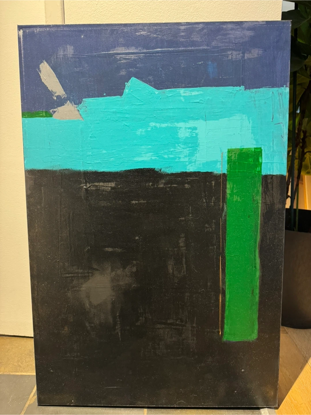 123Abstract art painting featuring a mix of colours like blue, black, and green. It's a unique piece that could add a pop of colour to any room in your home.